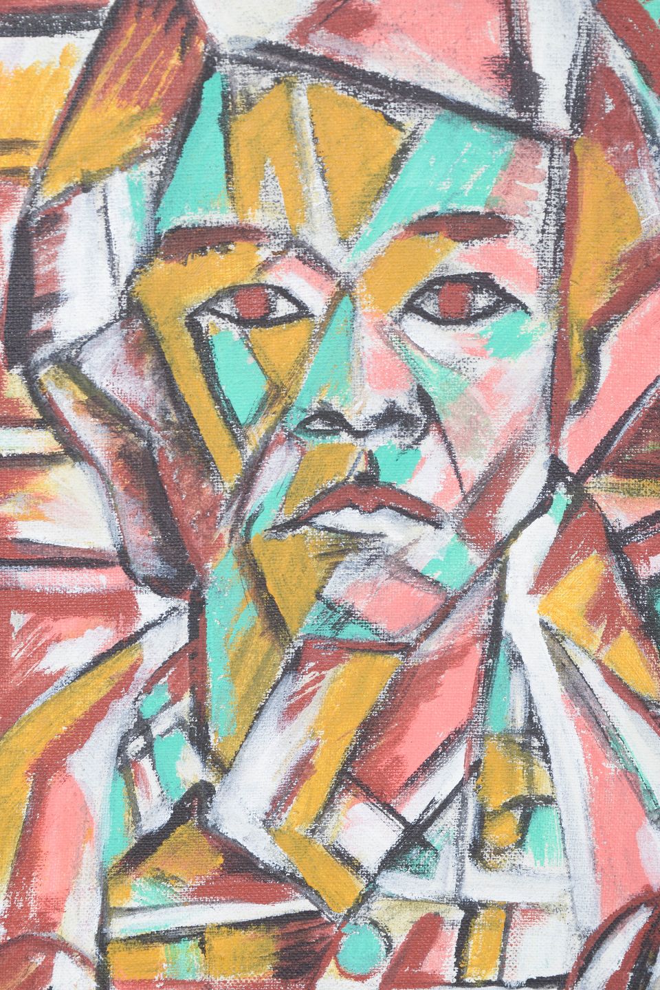 Colourful cubist-inspired figurative composition with a geometrically structured motif and expressive brushwork, executed in oil on canvas. Unsigned.
