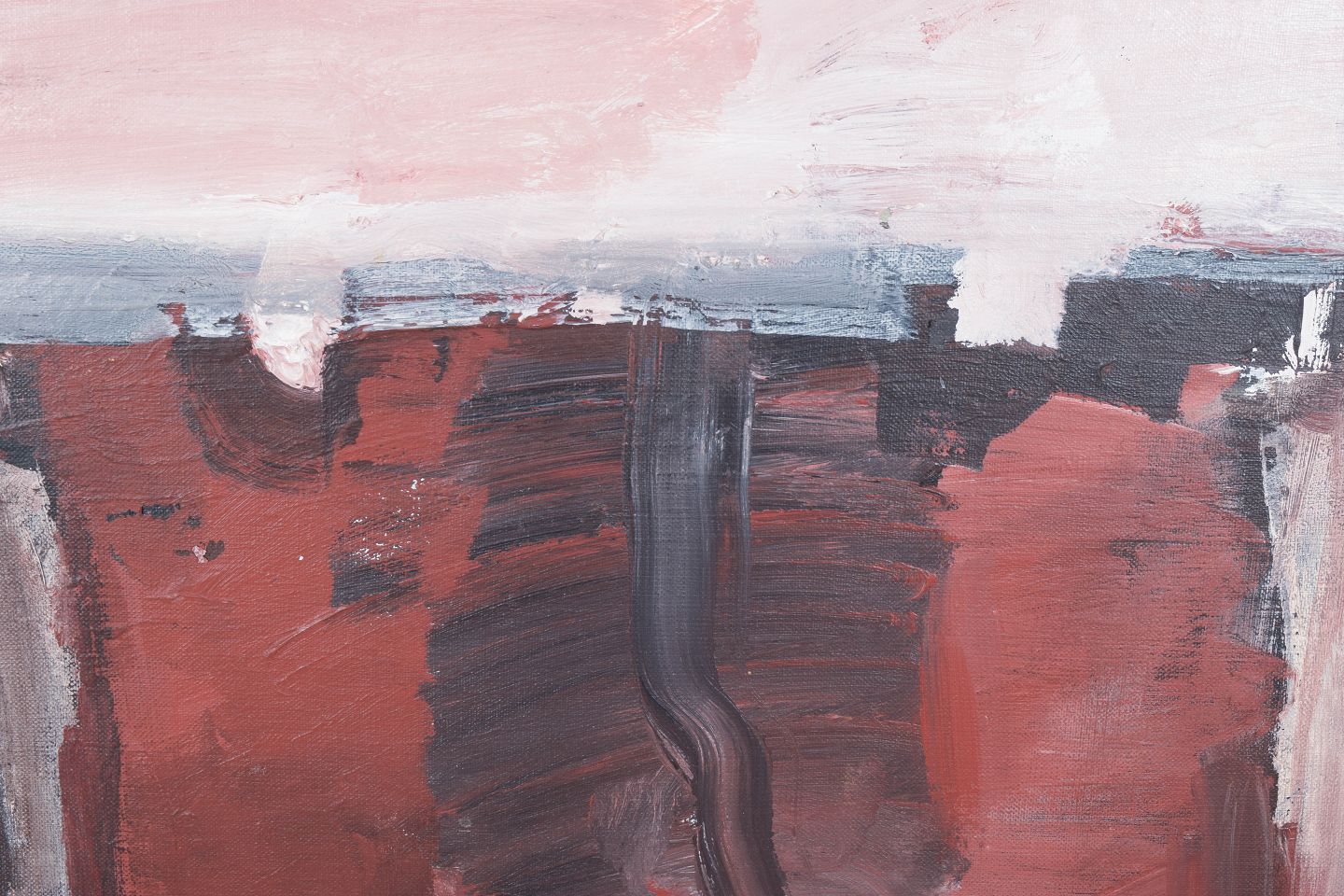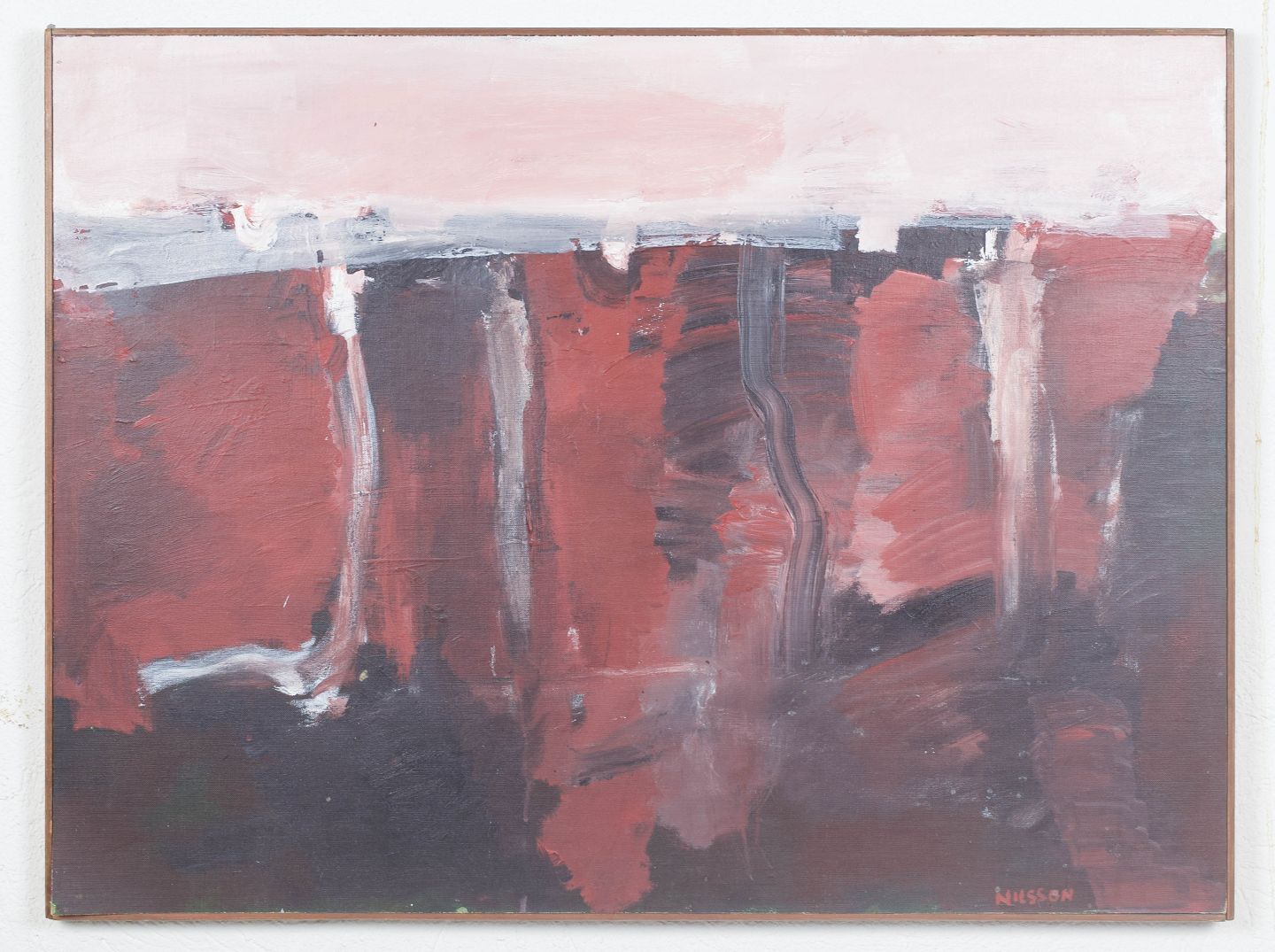 Abstract composition executed in oil on board with expressive brushwork and layered colour fields in muted reddish and grey tones. The composition shows a balanced tension between structure and spontaneity, signed.