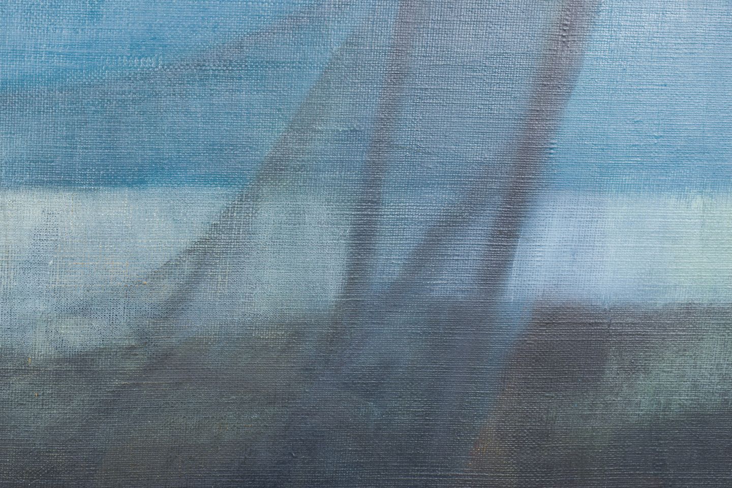 Modernist composition with a stylised landscape motif, where dark forms and net-like structures are rendered in a subdued and atmospheric palette. Executed in oil on canvas, signed and dated 1959.