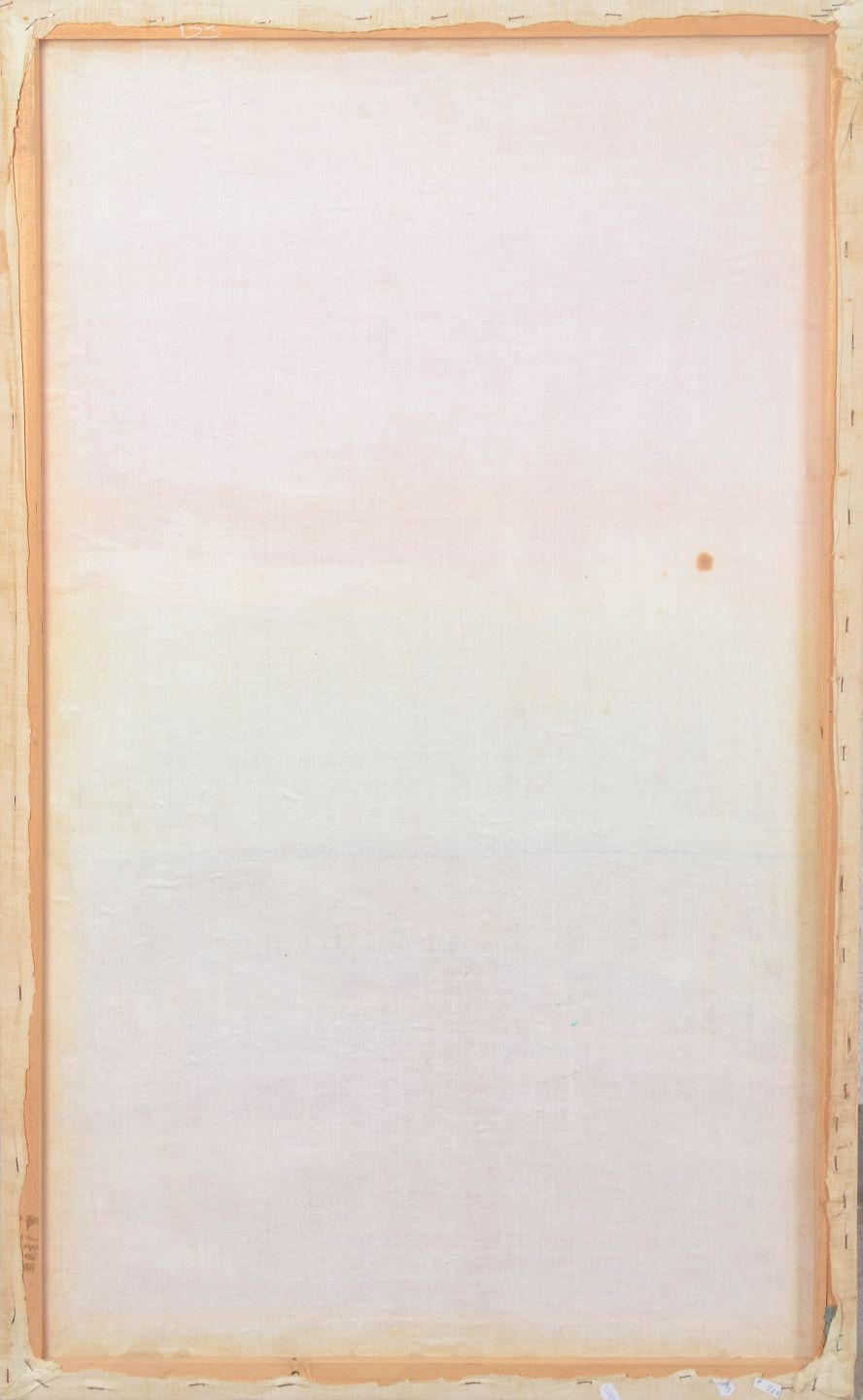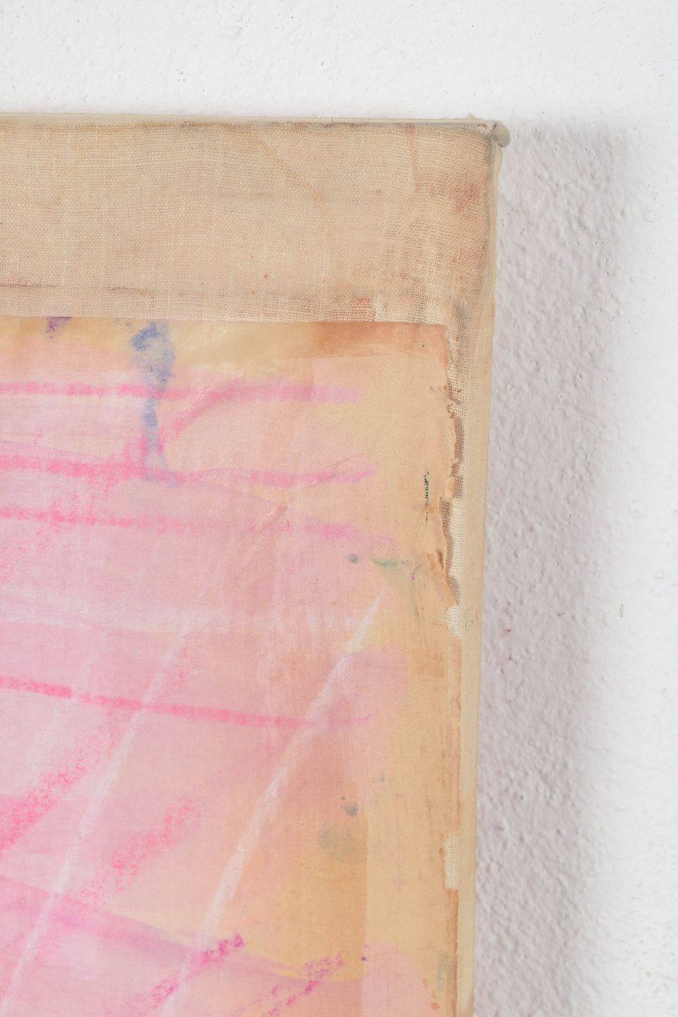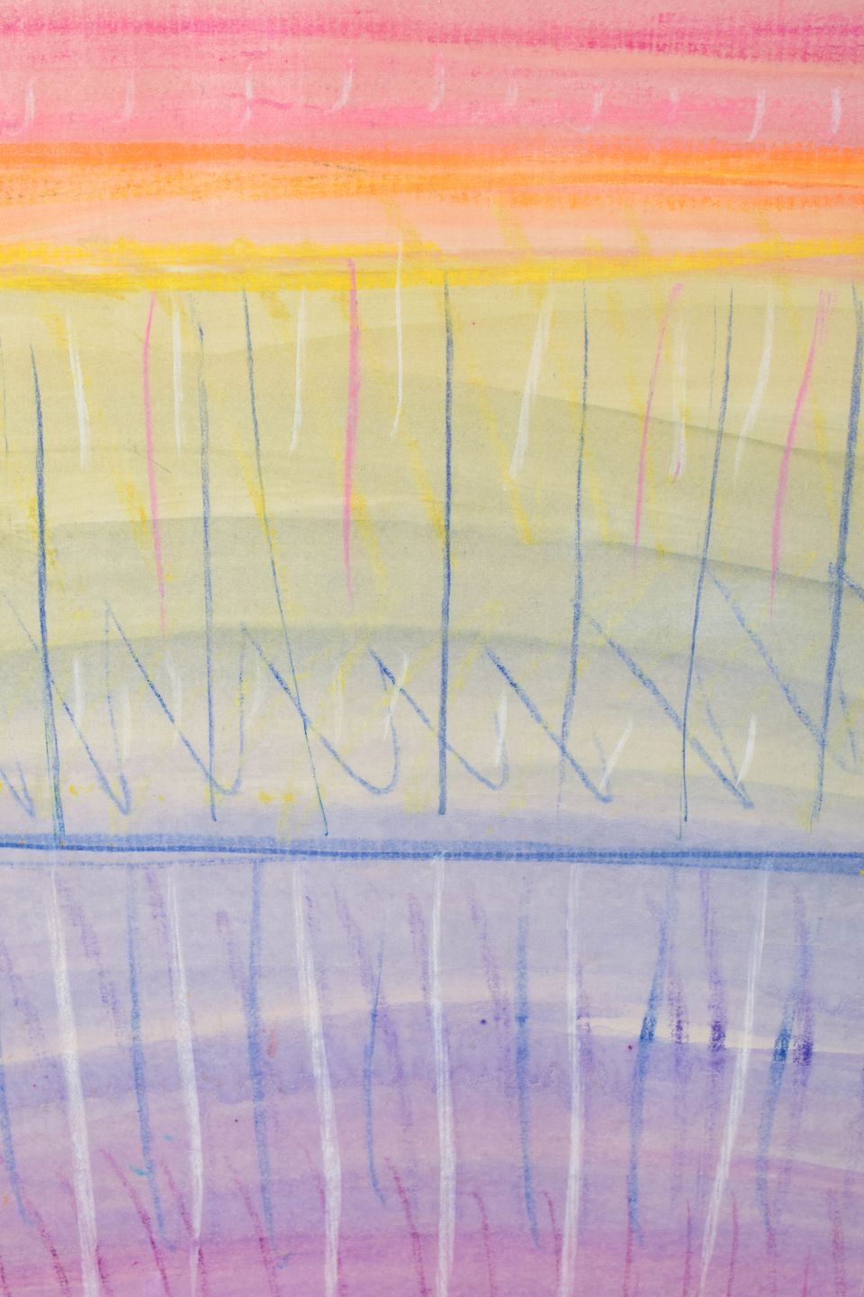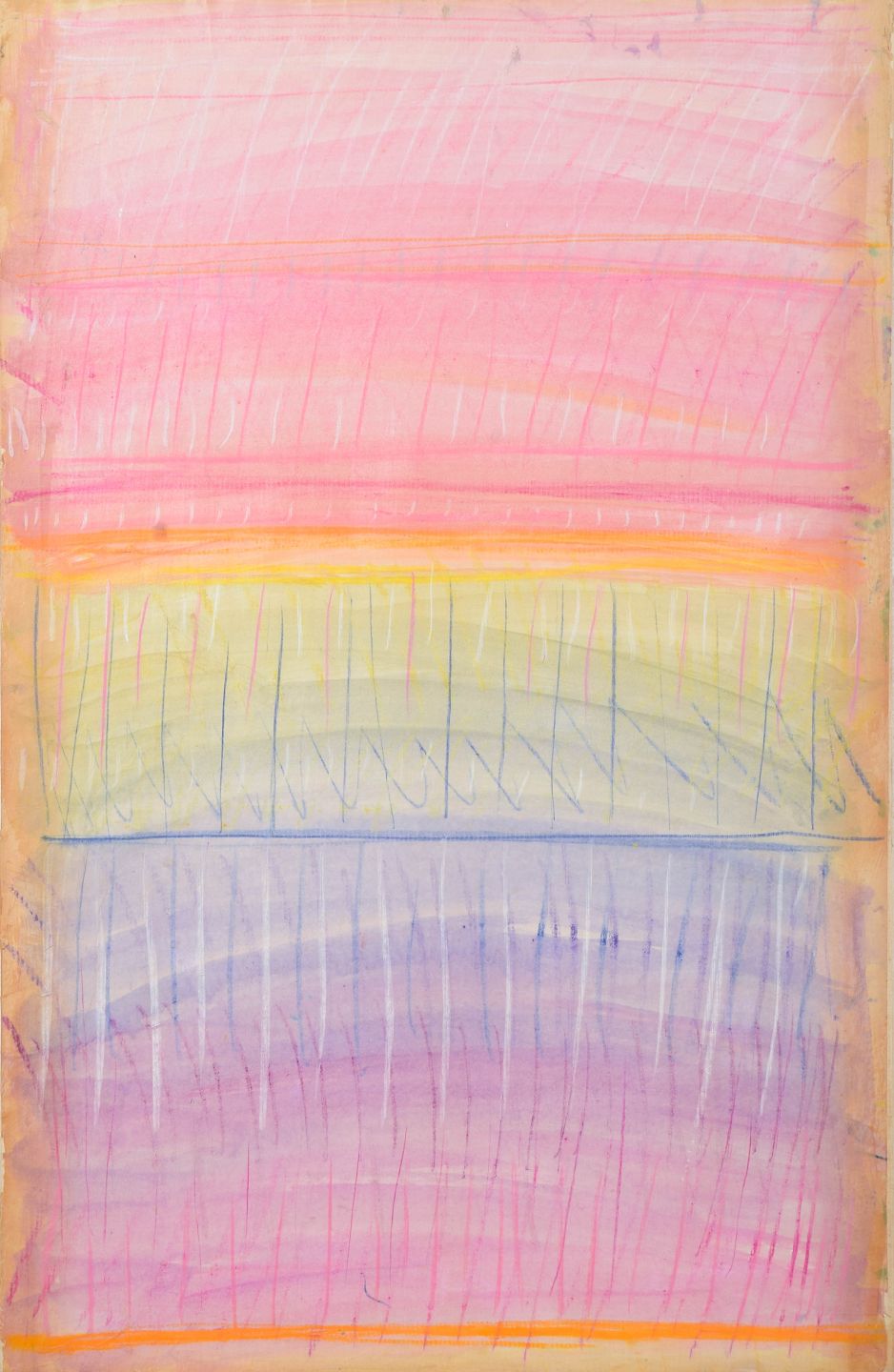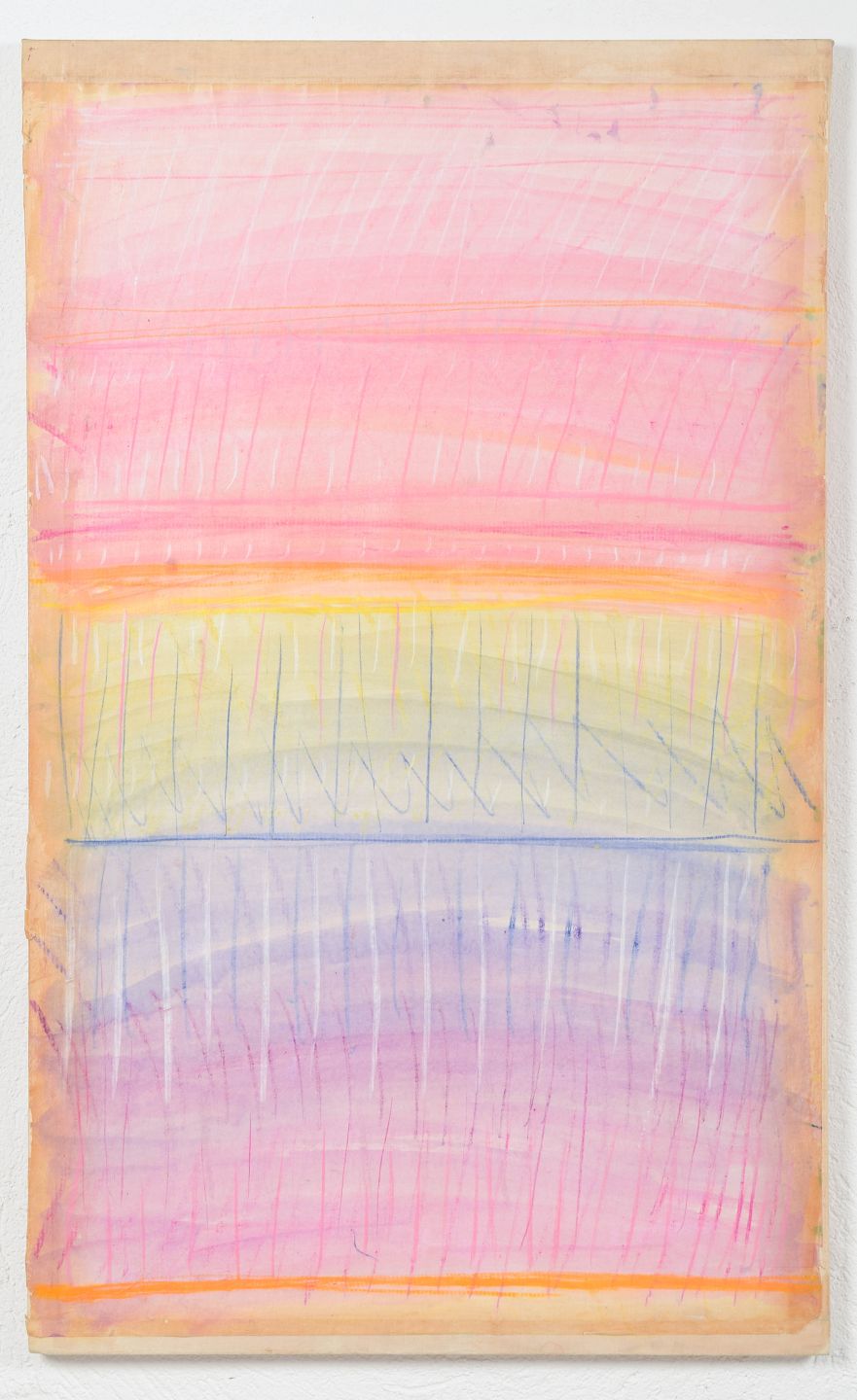 Abstract composition executed on paper mounted on canvas, with horizontal color fields in pink, yellow, and blue tones, combined with gestural line work.