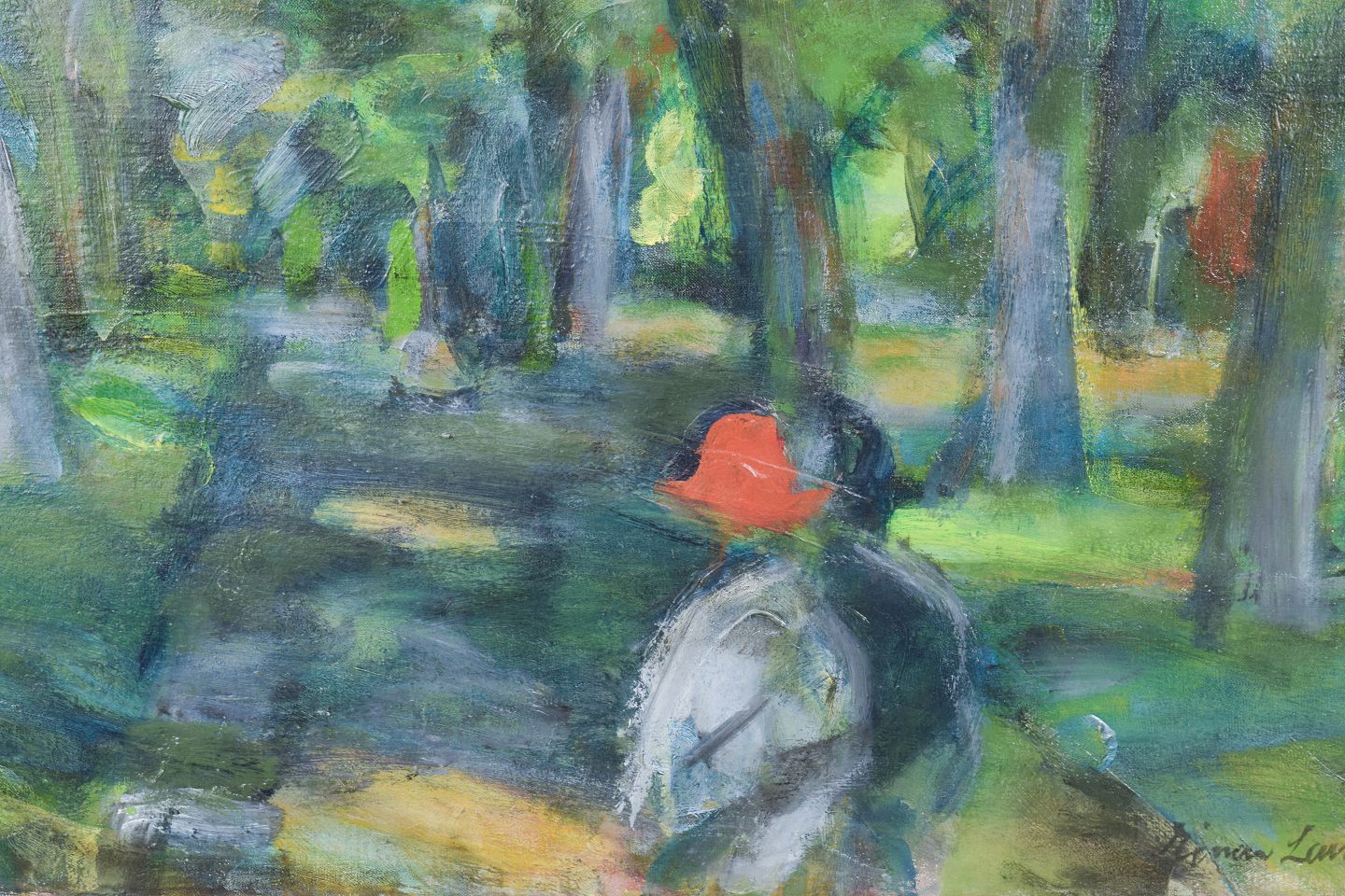 Modernist composition with a figurative motif set in a woodland landscape, executed with a loose and softly dissolved brushwork emphasizing light, colour, and atmosphere. Signed and dated 1965.