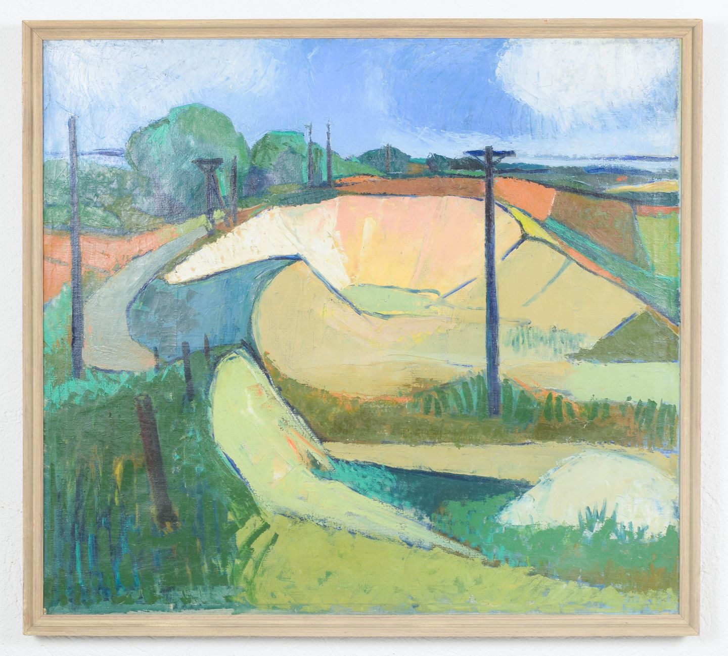 Colourful landscape composition executed in an early modernist style with soft, organic forms and simplified planes. The composition reflects a lyrical interpretation of nature, with fields, hills, and telegraph poles rendered in a decorative and semi-abstract manner. Executed in oil on canvas, unsigned.