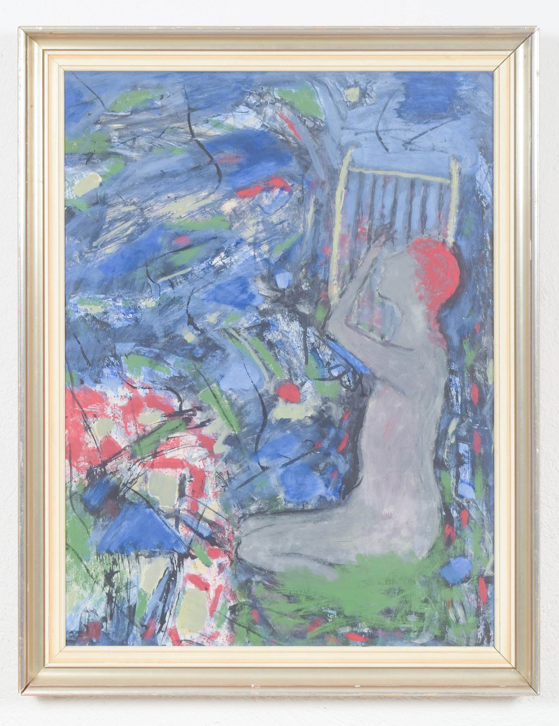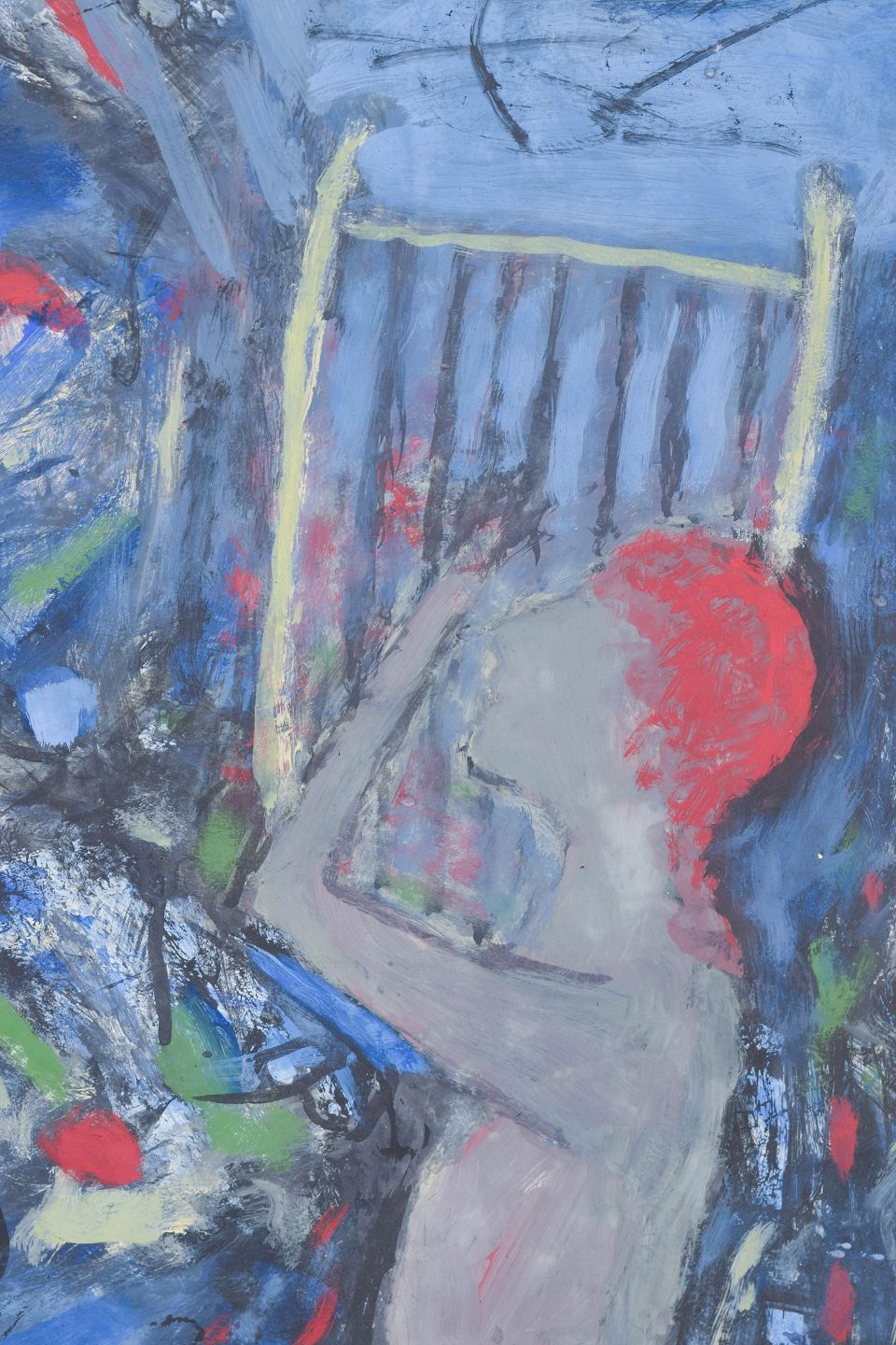 Abstract composition with dynamic brushwork and layered fields of colour in blue, green, and red tones, executed in oil on board. Unsigned.