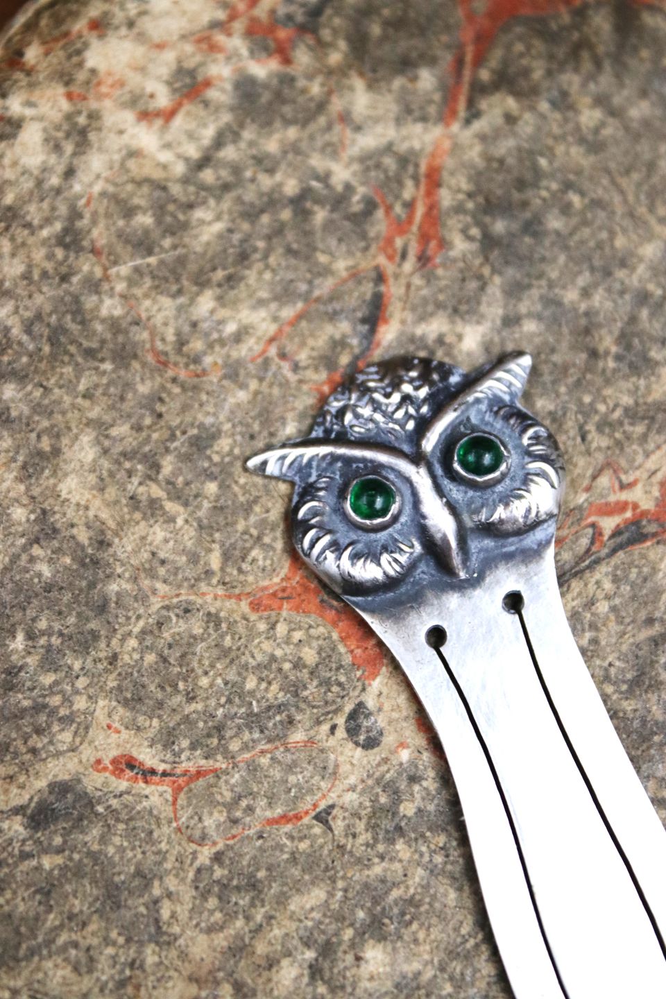 Old silver bookmark in the shape of a small owl with green glass eyes. Stamped 830s.