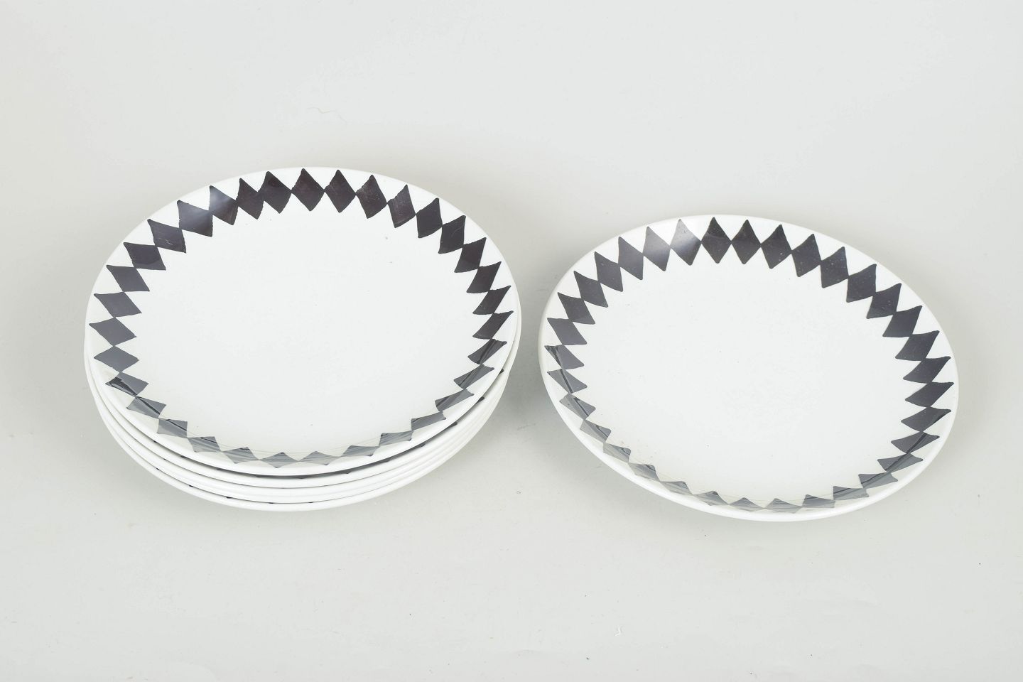 Set consisting of six small lunch plates in porcelain featuring a distinctive black diamond pattern, designed in a simple and functional style typical of the period.