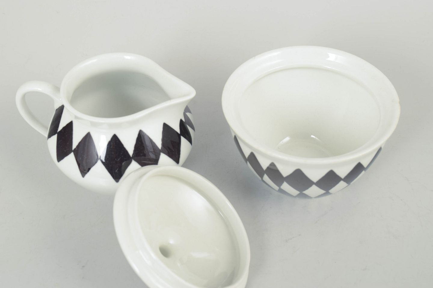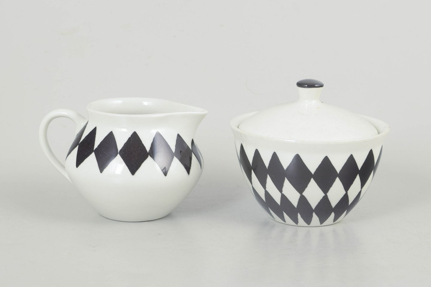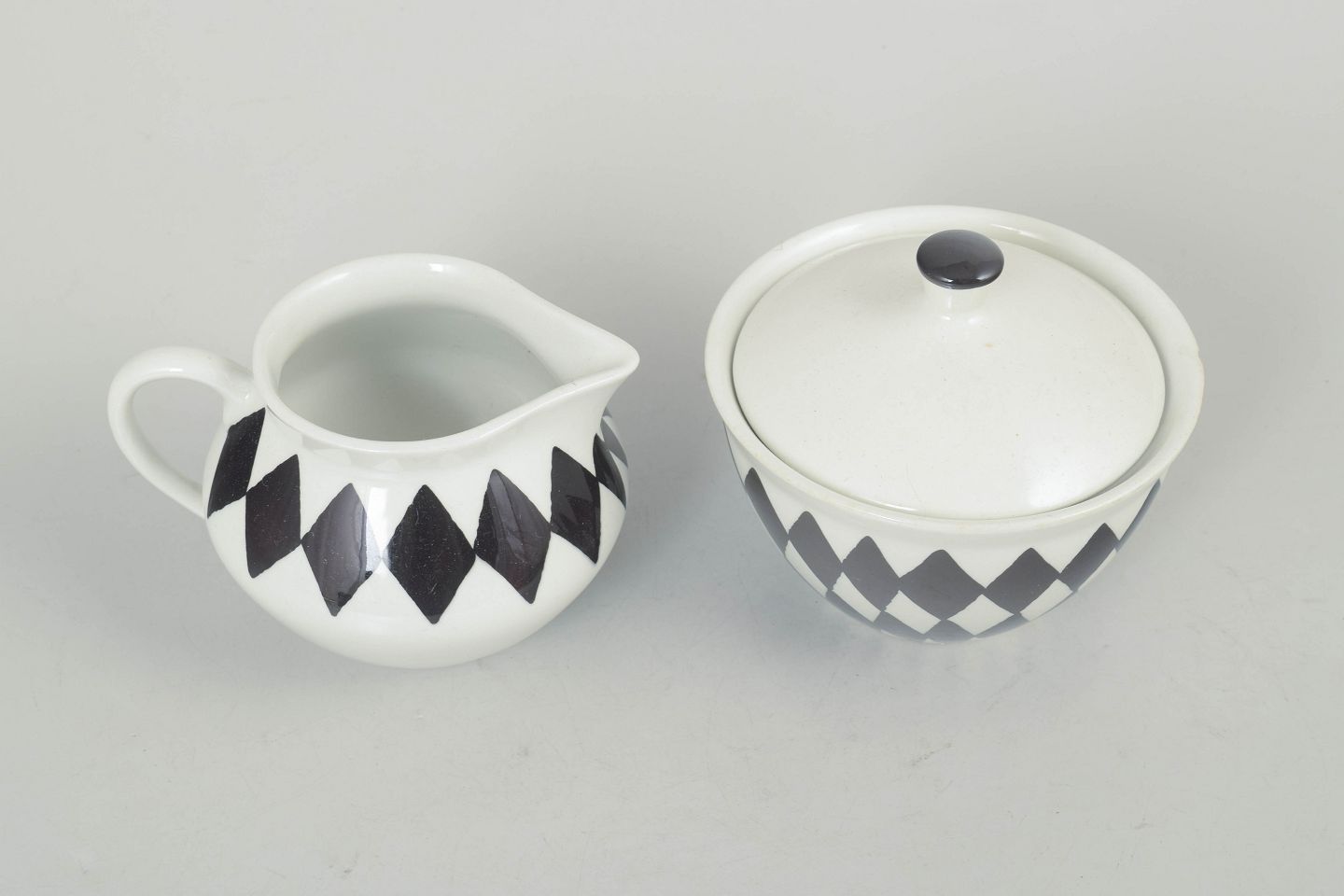Set consisting of lidded sugar bowl and creamer in porcelain with a distinctive black diamond pattern, designed in a simple and functional style typical of the period.