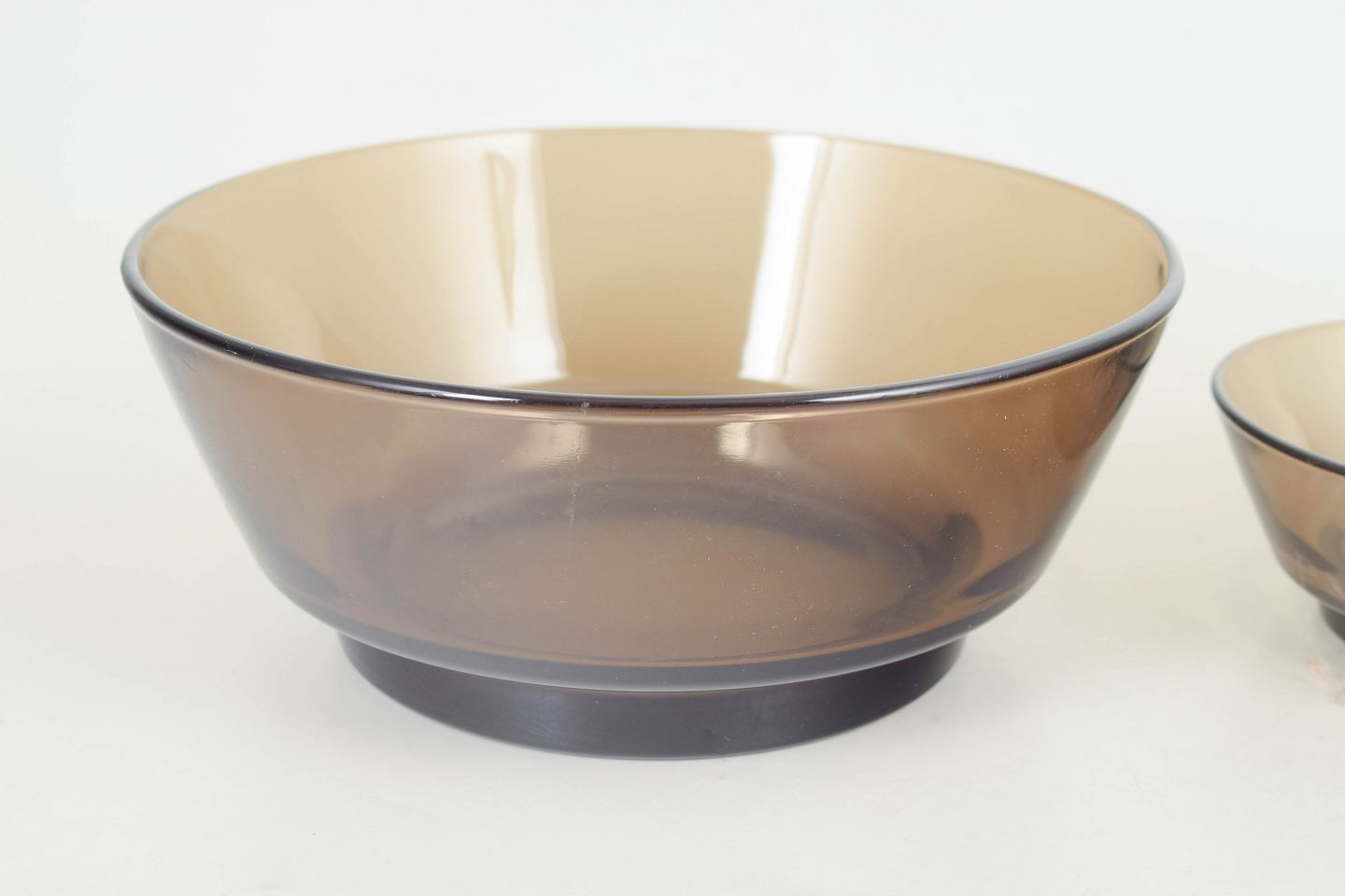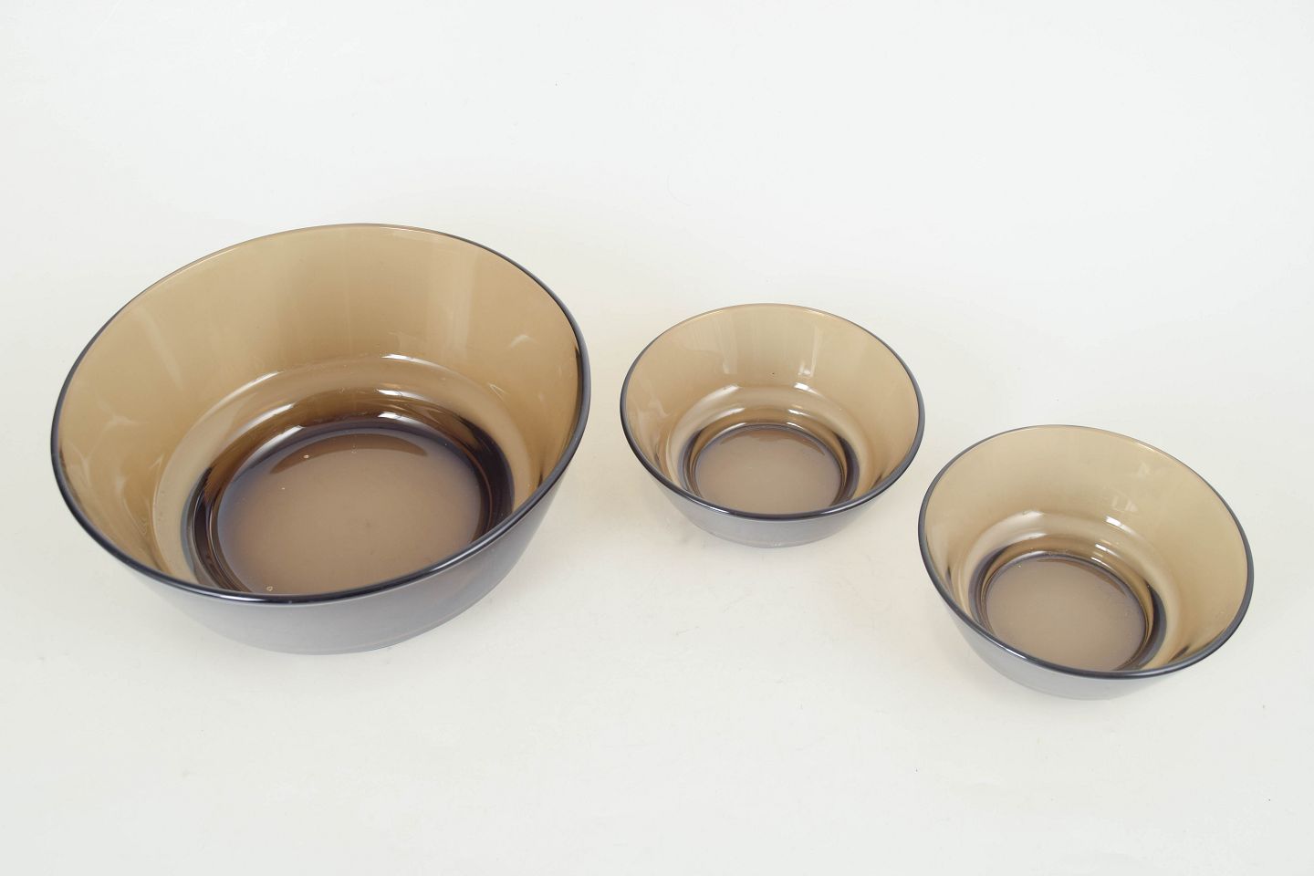 Set consisting of two small bowls and one large bowl in pressed glass with a gently conical shape and smoky tint, produced in France and marked by the manufacturer.