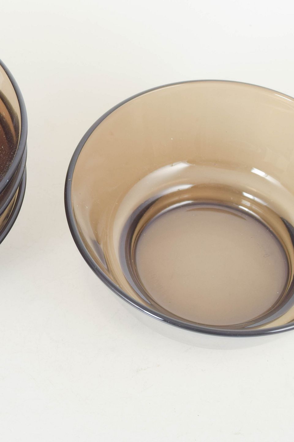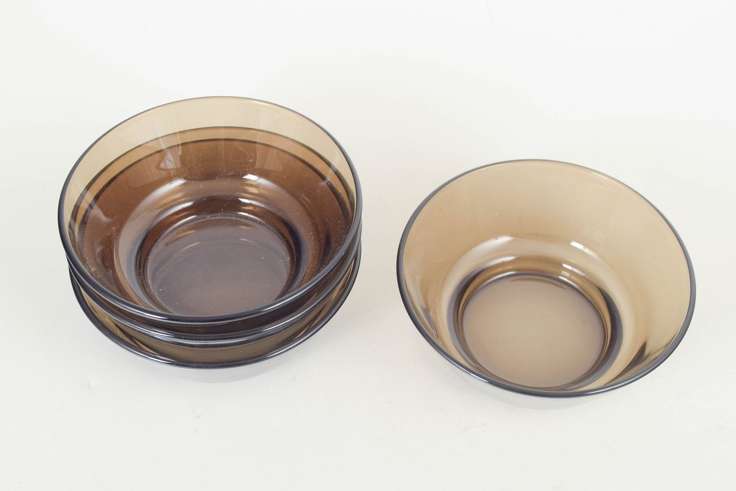 Set of four stackable pressed glass bowls with a gently conical shape and smoky tint, produced in France and marked by the manufacturer.