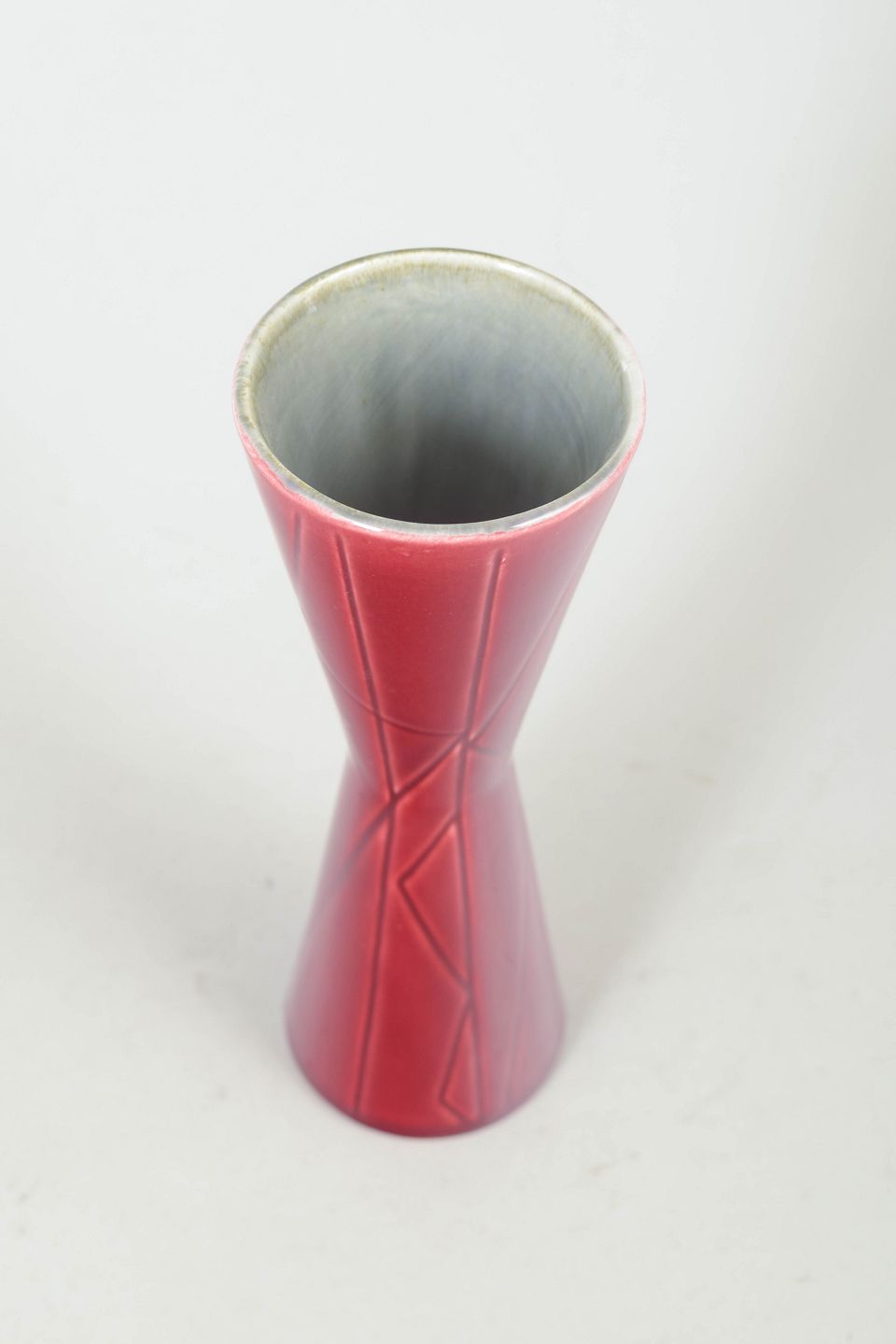 Slender hourglass-shaped vase in glazed stoneware with a deep red glaze and incised decoration. The model "California" is a characteristic example of Stålhane’s refined and disciplined ceramic design from the period.