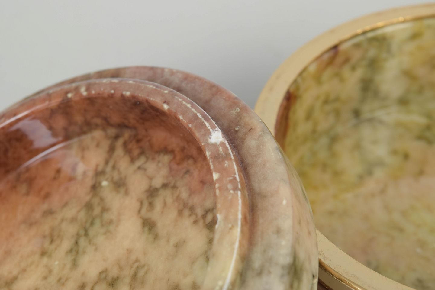 Italian alabaster production has for centuries been centred around Volterra in Tuscany. In the 20th century, particularly during the Art Deco period, alabaster was widely used for decorative boxes and interior objects, where the material’s natural colour variations and translucency were highlighted through simple, elegant forms and the use of metals such as brass.