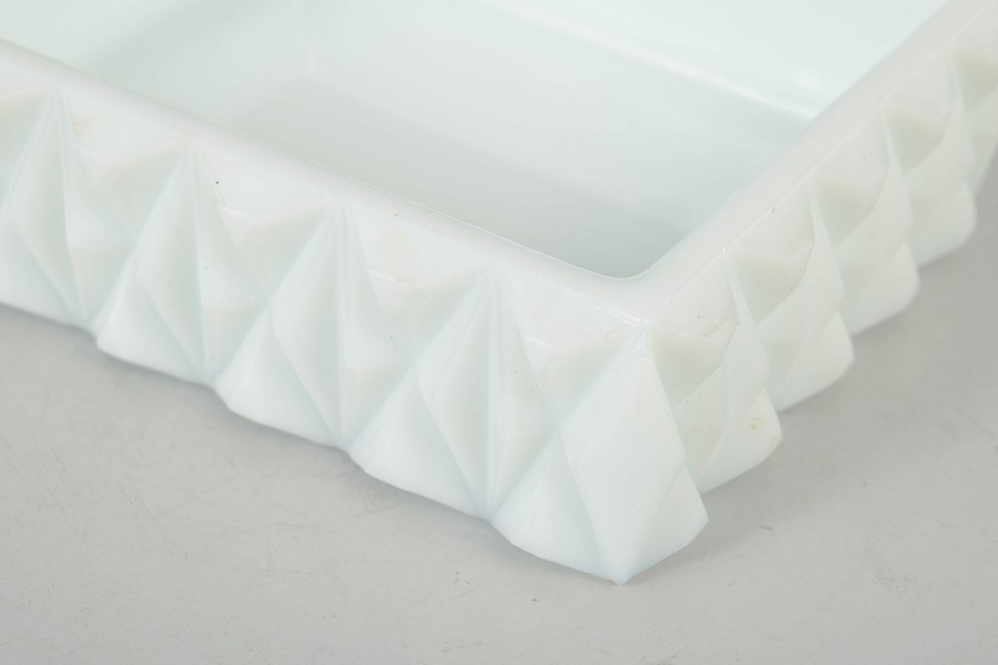 Rectangular lidded box in opaline glass with geometric relief decoration of repeating pyramid motifs. The white material has a subtle translucency that enhances the structured Art Deco design.