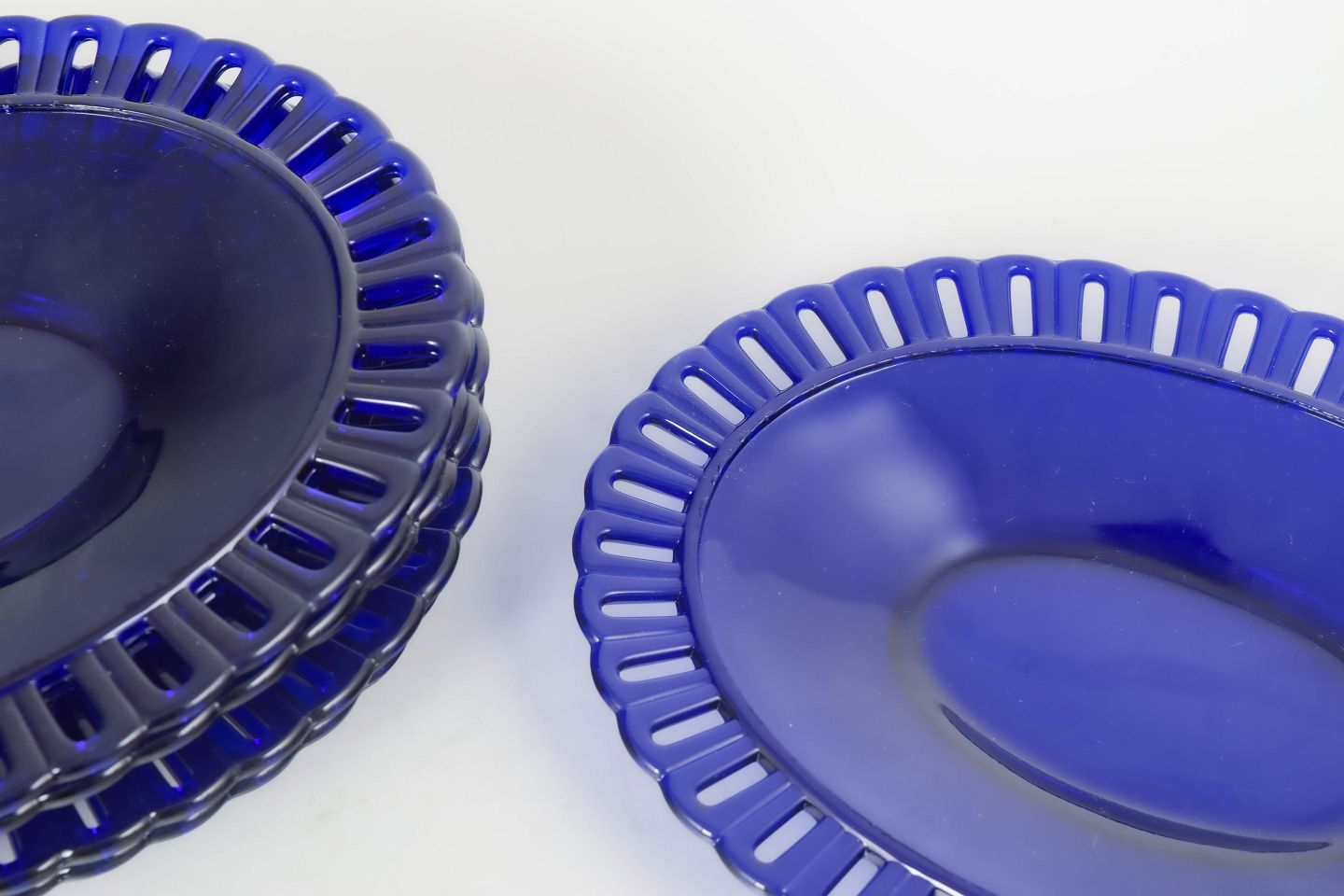 Elegant pressed glass plates in deep cobalt blue with a distinctive openwork rim in filigree design. A striking example of Swedish glass design from the mid 20th century.