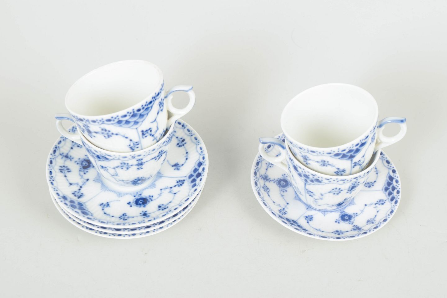 Royal Copenhagen Blue Fluted Half Lace, set of four coffee cups with saucers.