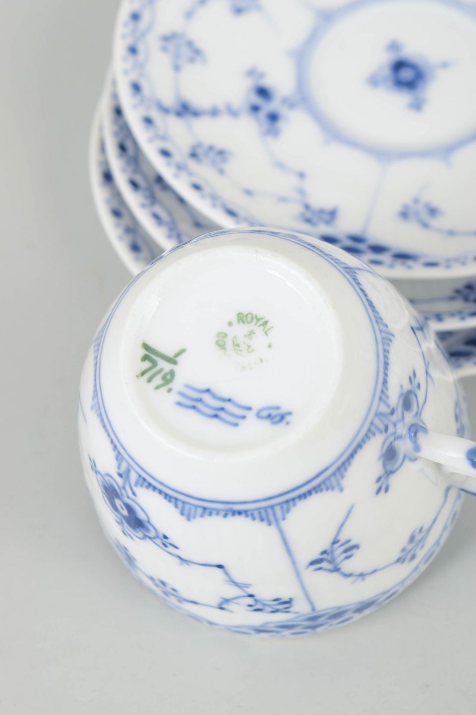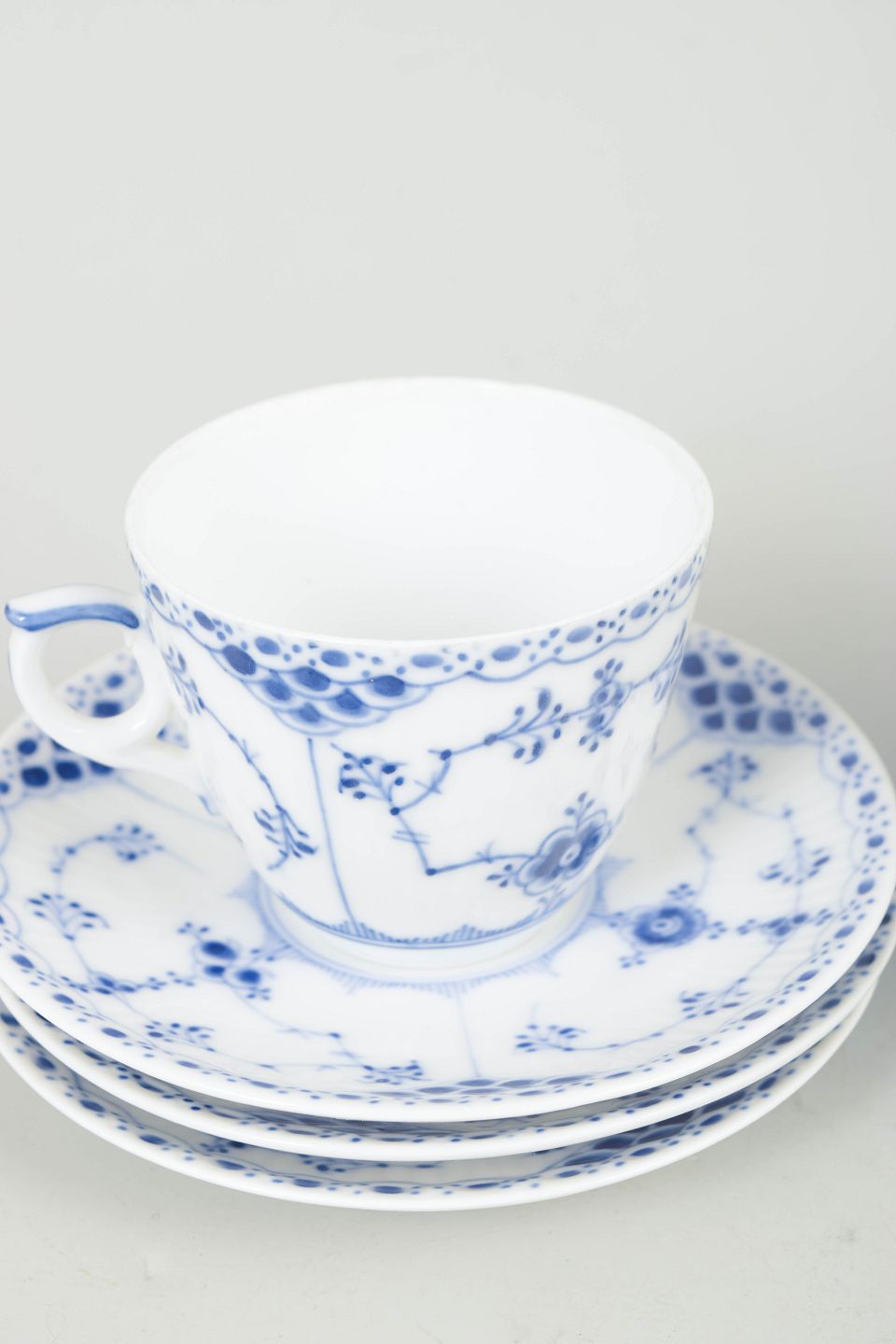 Royal Copenhagen Blue Fluted Half Lace, set of three coffee cups with saucers.