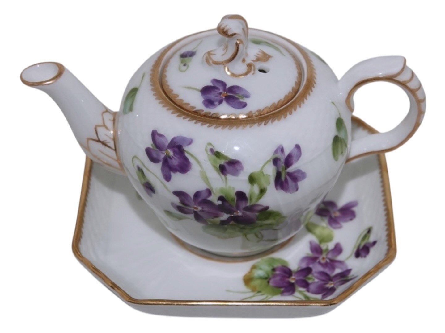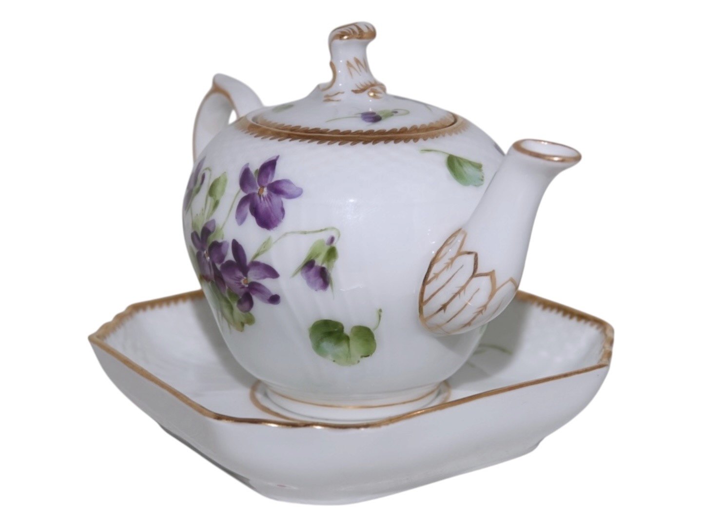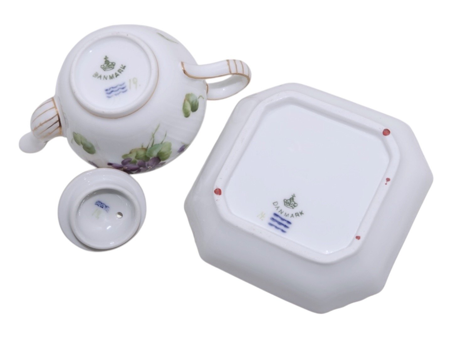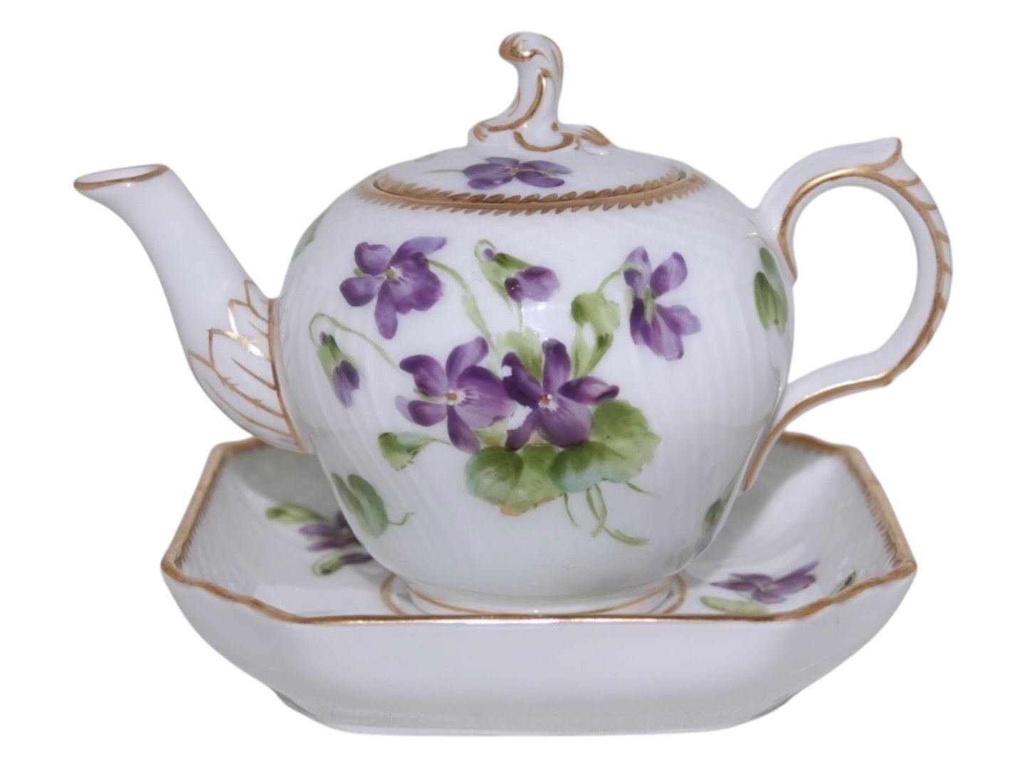 Royal Copenhagen Blue Viols with gold edge, miniature teapot with platter.