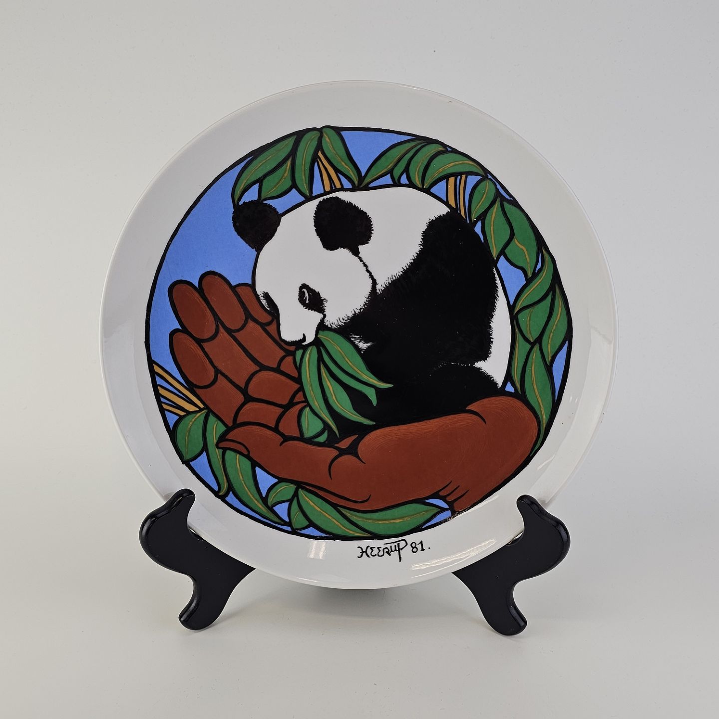 Text available in Danish: Platte af kongeligt porcelæn med motiv af en panda, som sidder i en åben hånd. Nr. 307/1000