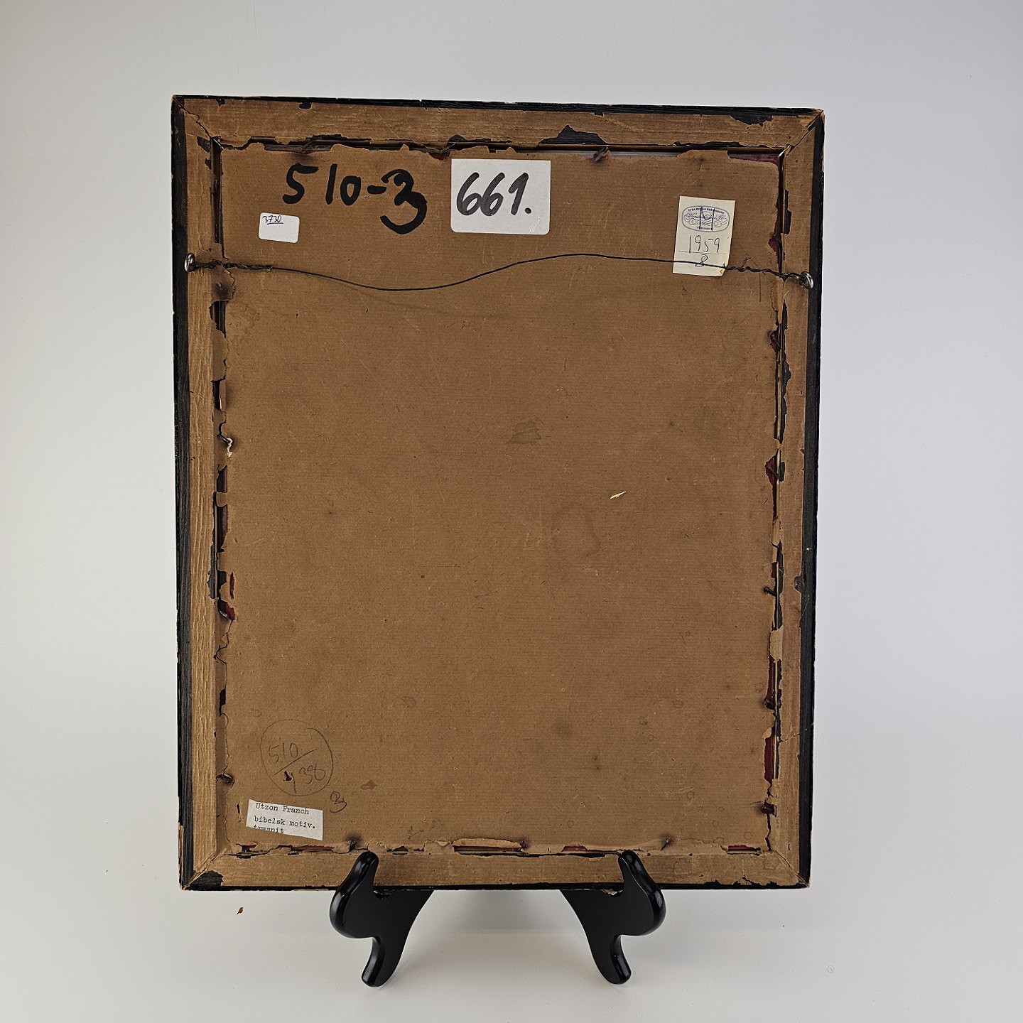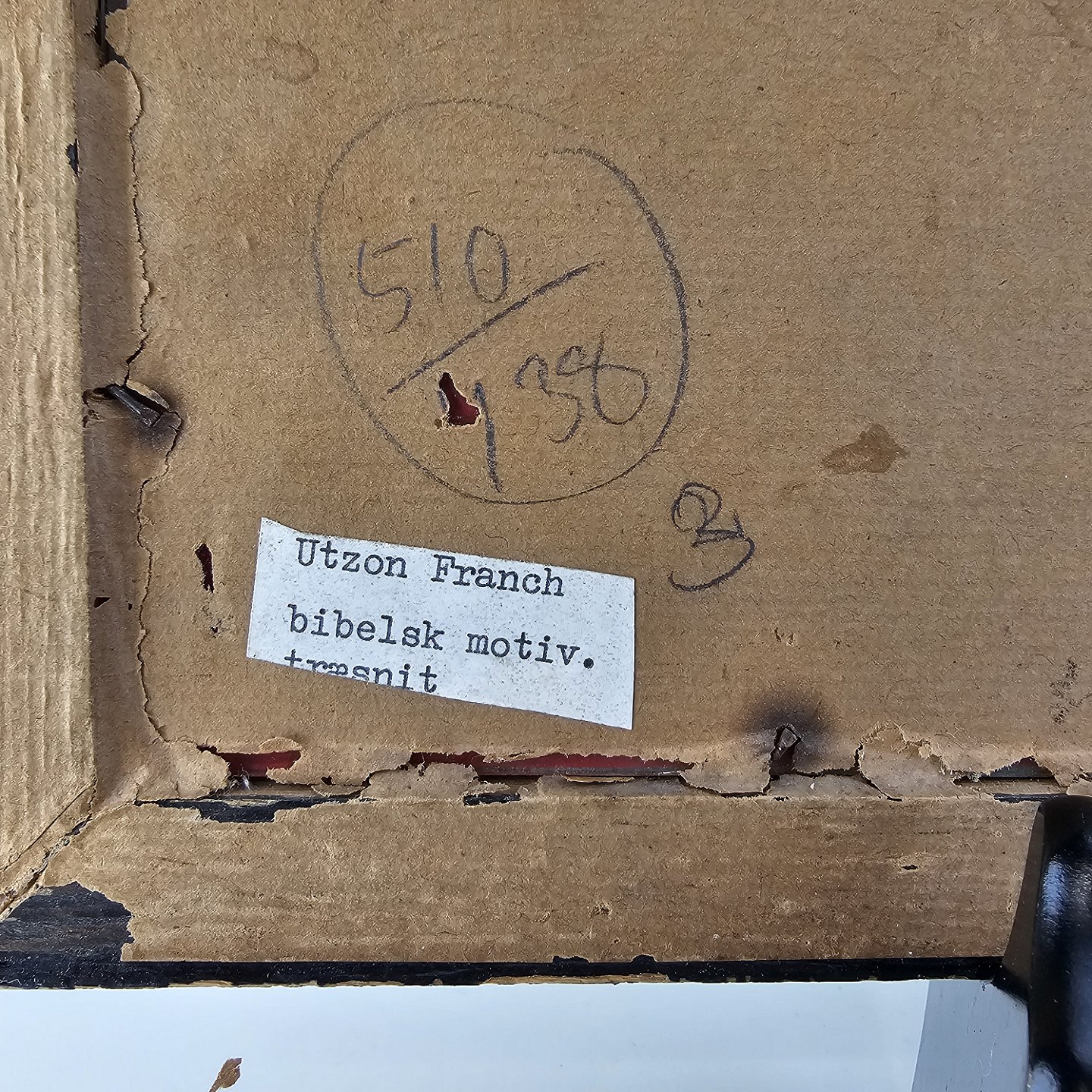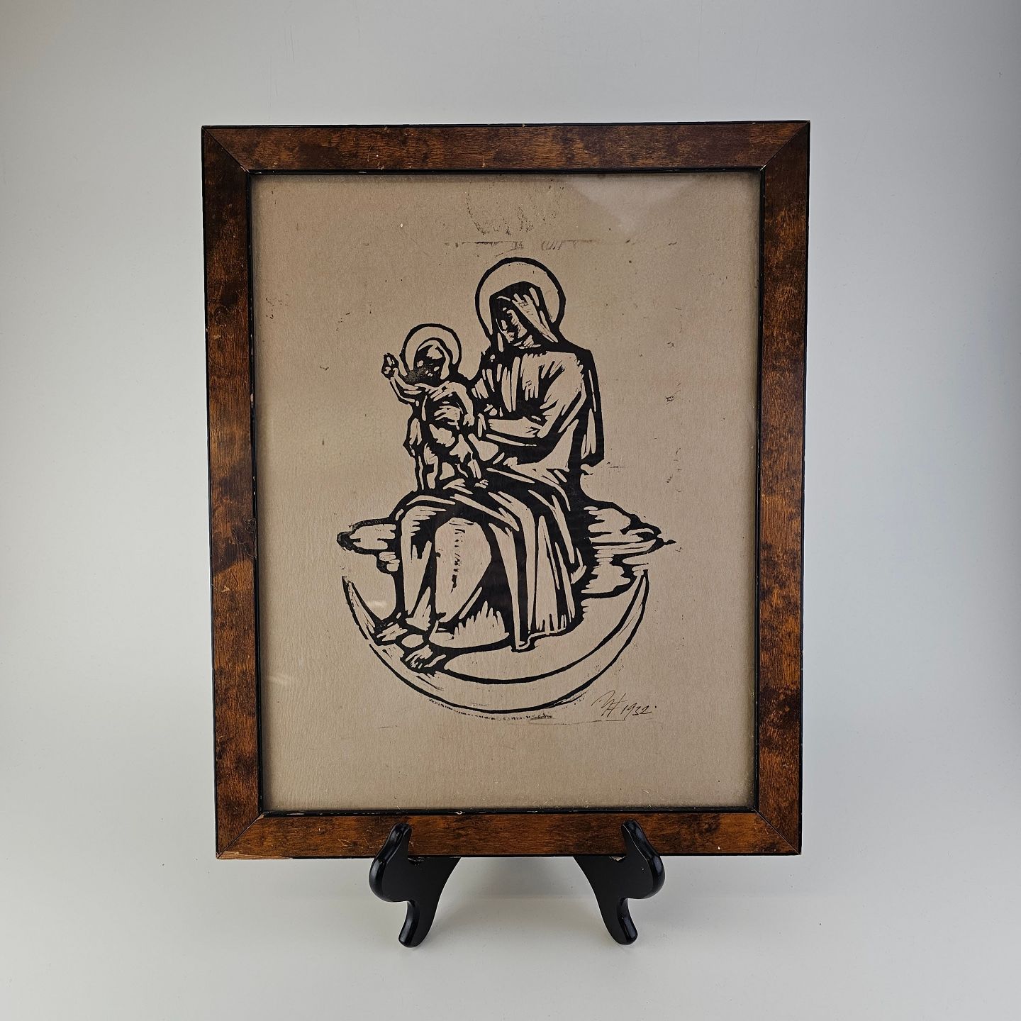 Trykt træsnit med bibelsk motiv, monteret i træramme og dateret 1932