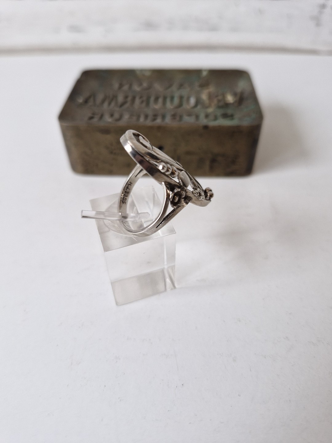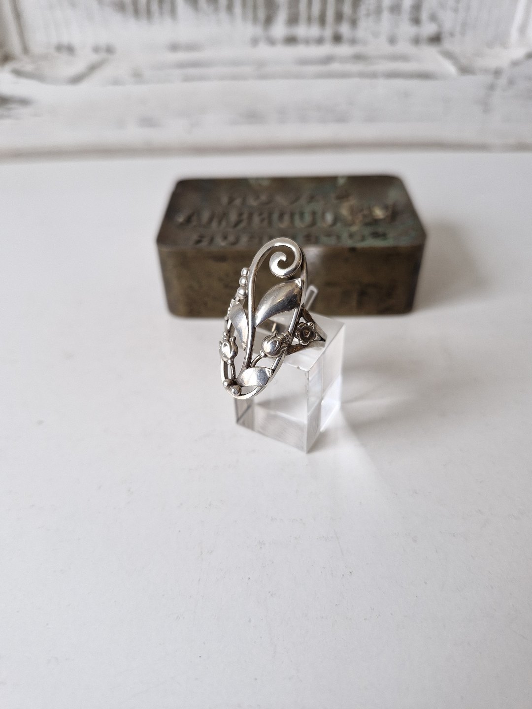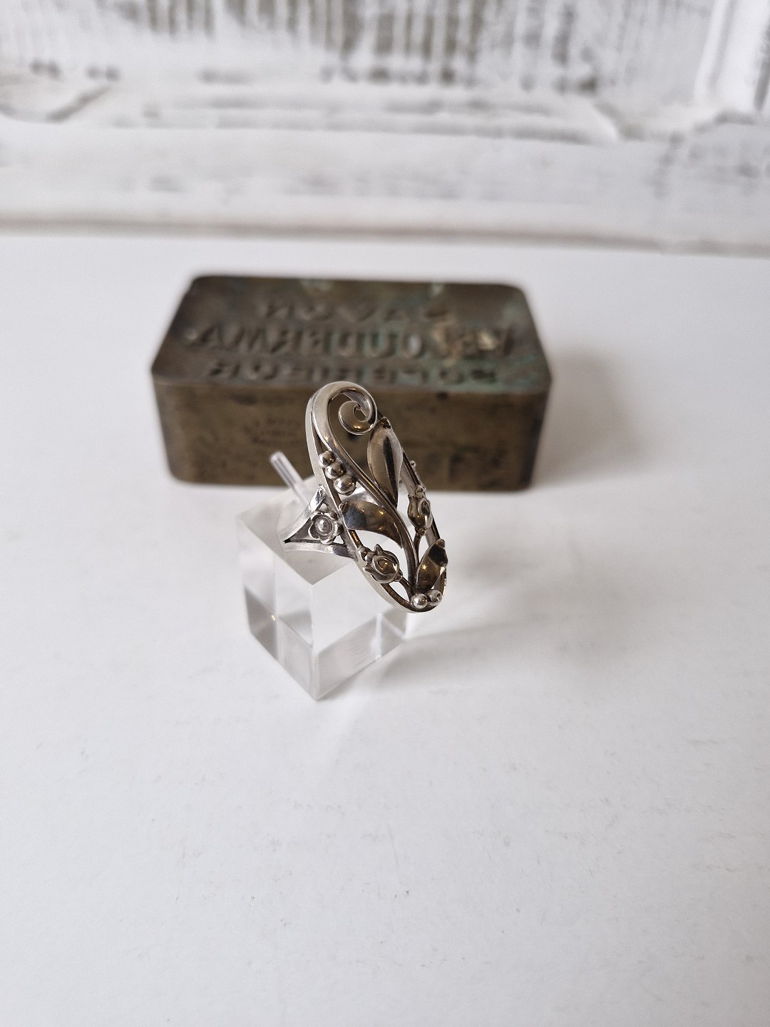 Beautiful silver ring in the art deco style decorated with flowers and leaves.