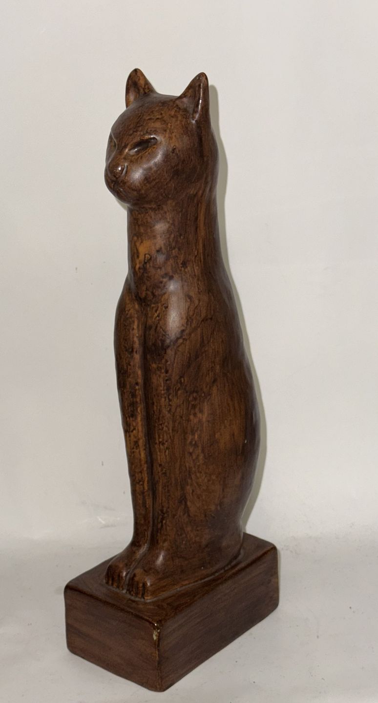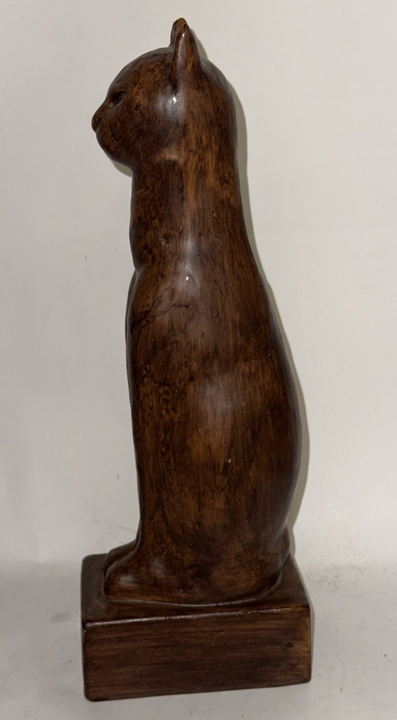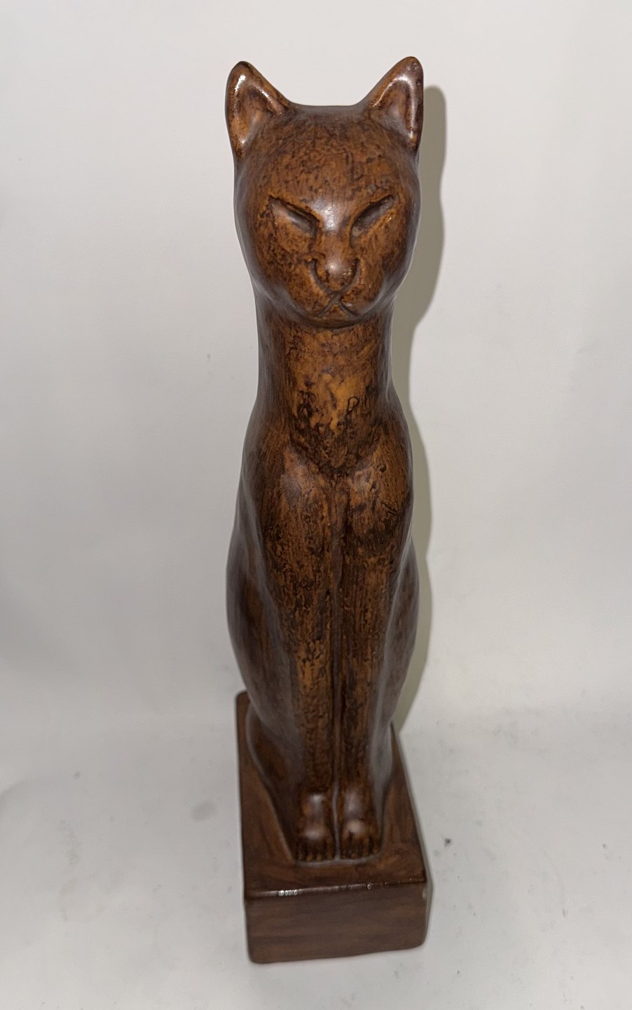Figur af siddende kat i keramik af Emil Ruge. Dækket af brun glasur. Signeret af kunstneren på soklens inderside. H. 30 cm