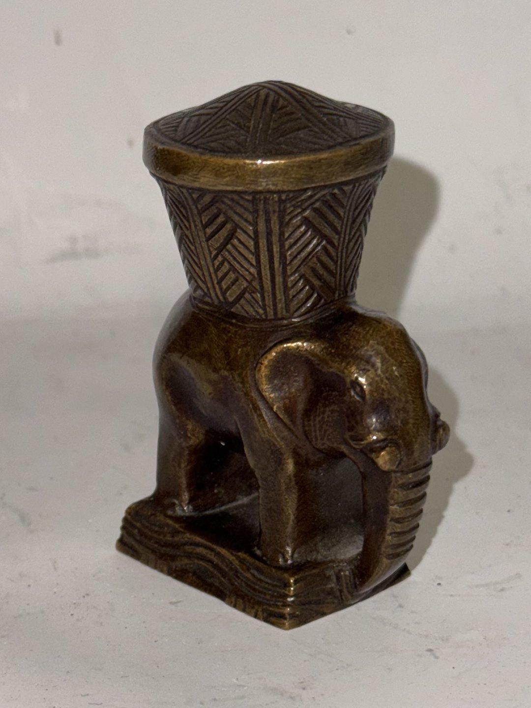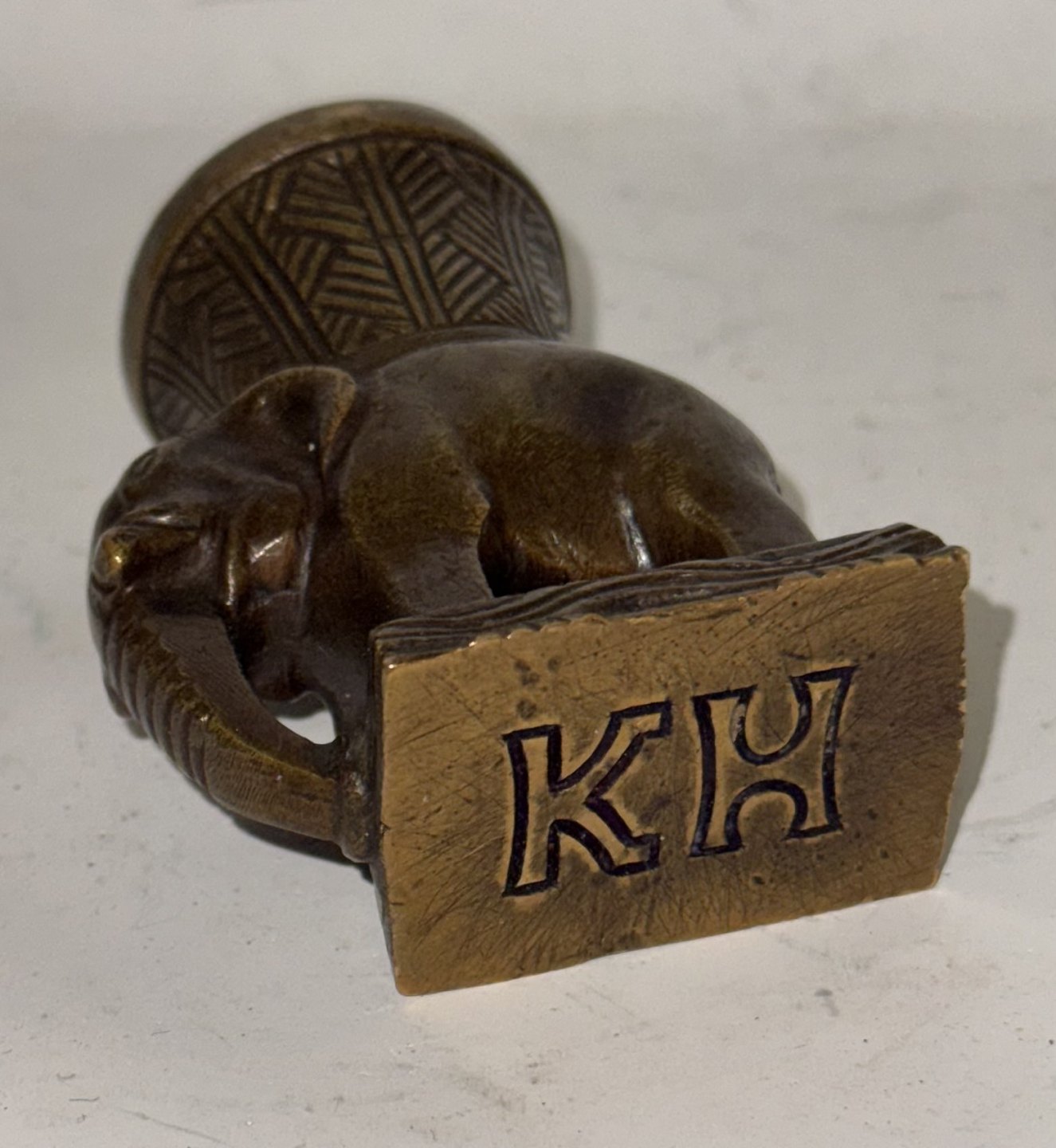 Mogens Ballin (1871-1914): Figure of elephant with basket on back in bronze. Cast in one piece. In good condition. On the bottom engraved KH. Not stamped with artist initials. Previously sold a similar figure by Mogens Ballin in pewter, which functioned as a flintlock. The pewter version had model number T135. H. 6.8 cm.