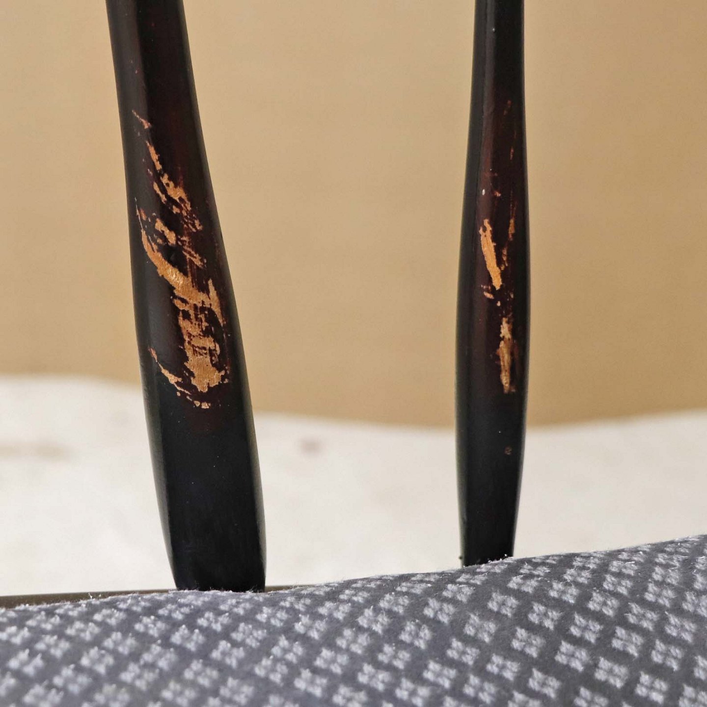 Tremme gyngestol i sortlakeret træ med fastmonteret polstret stofbetrukket sæde i grå farve med lyst mønster. Model 181