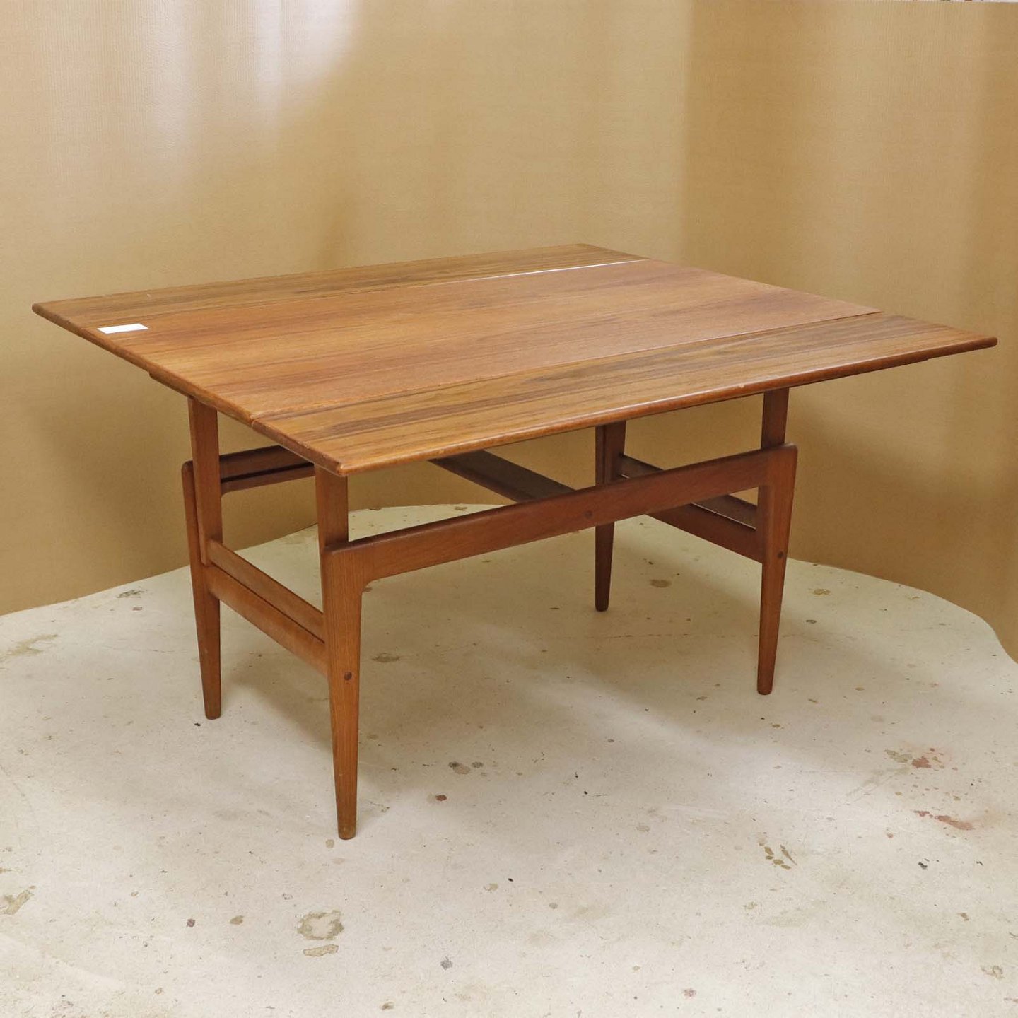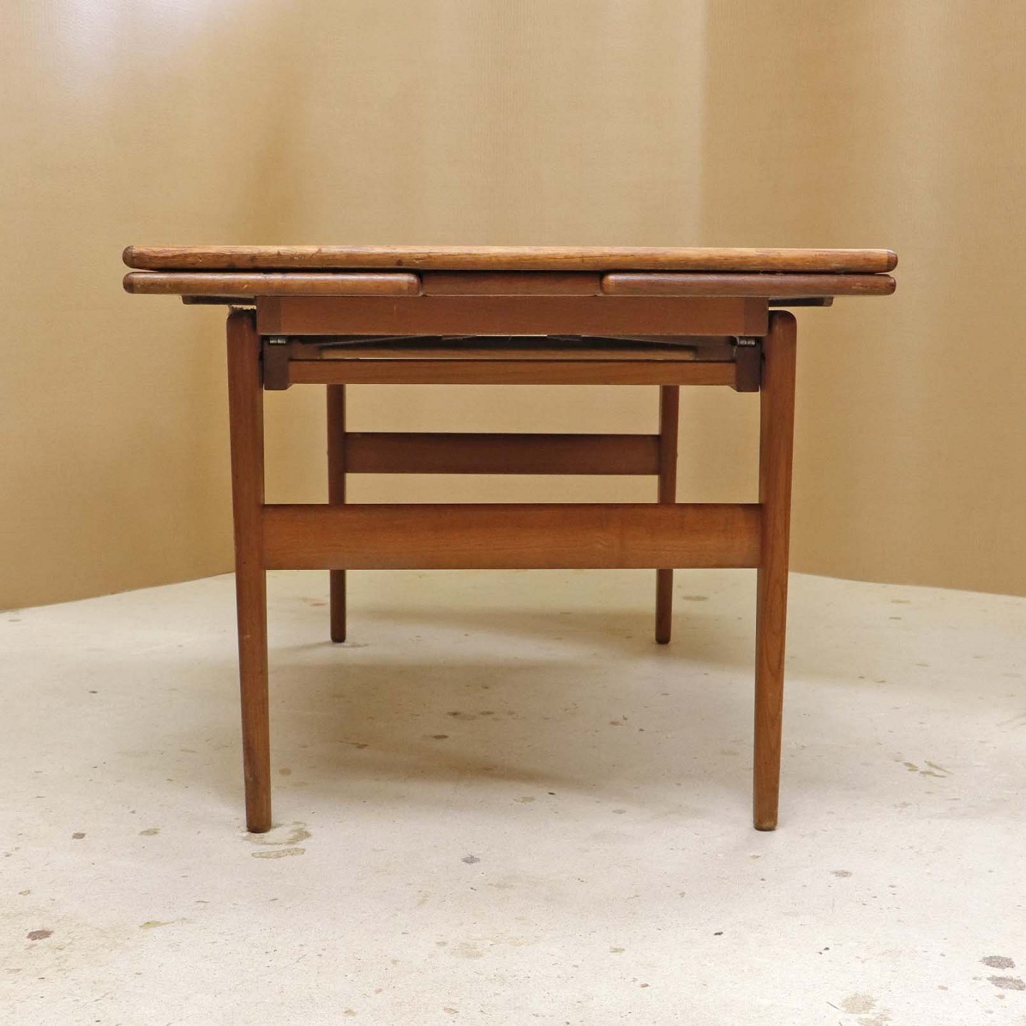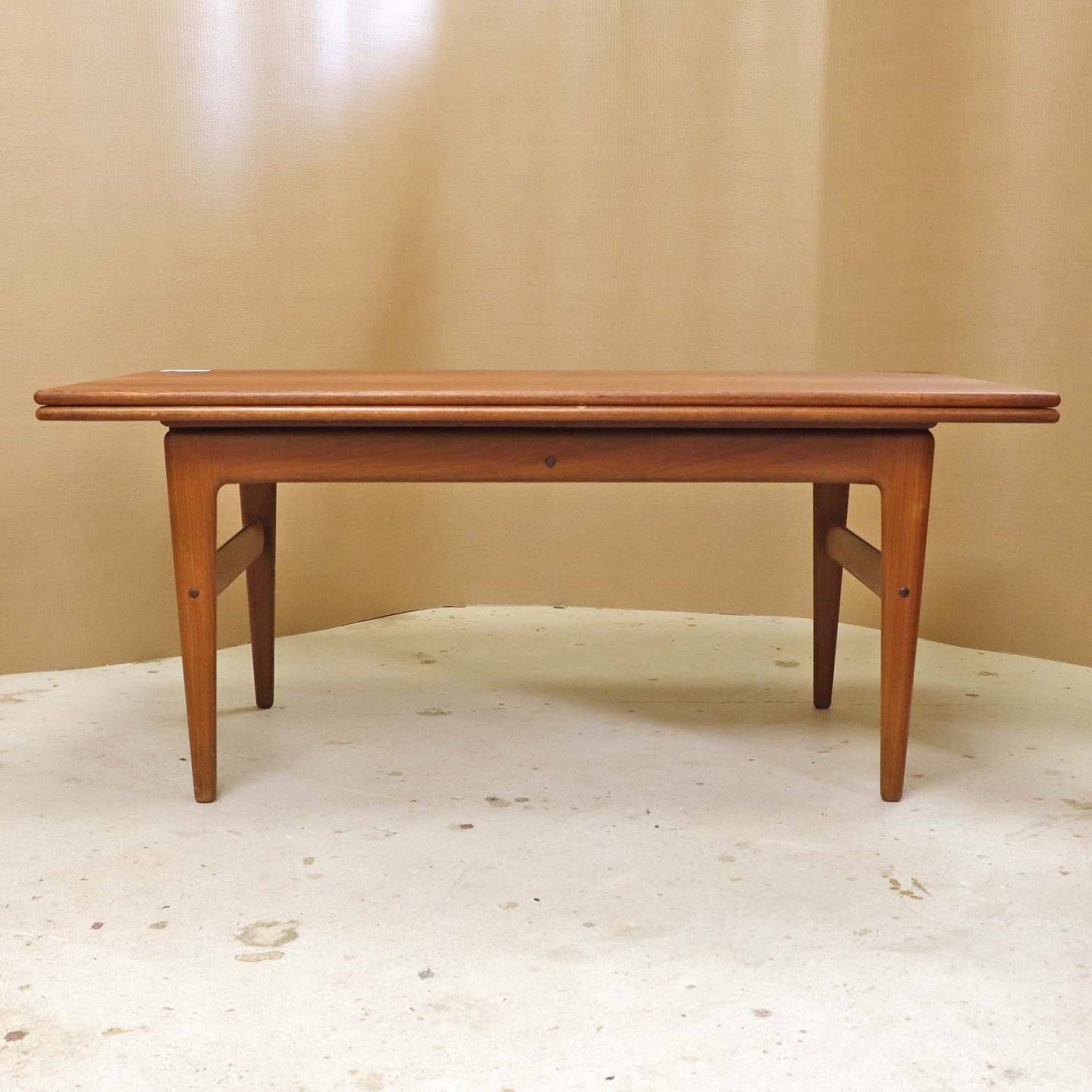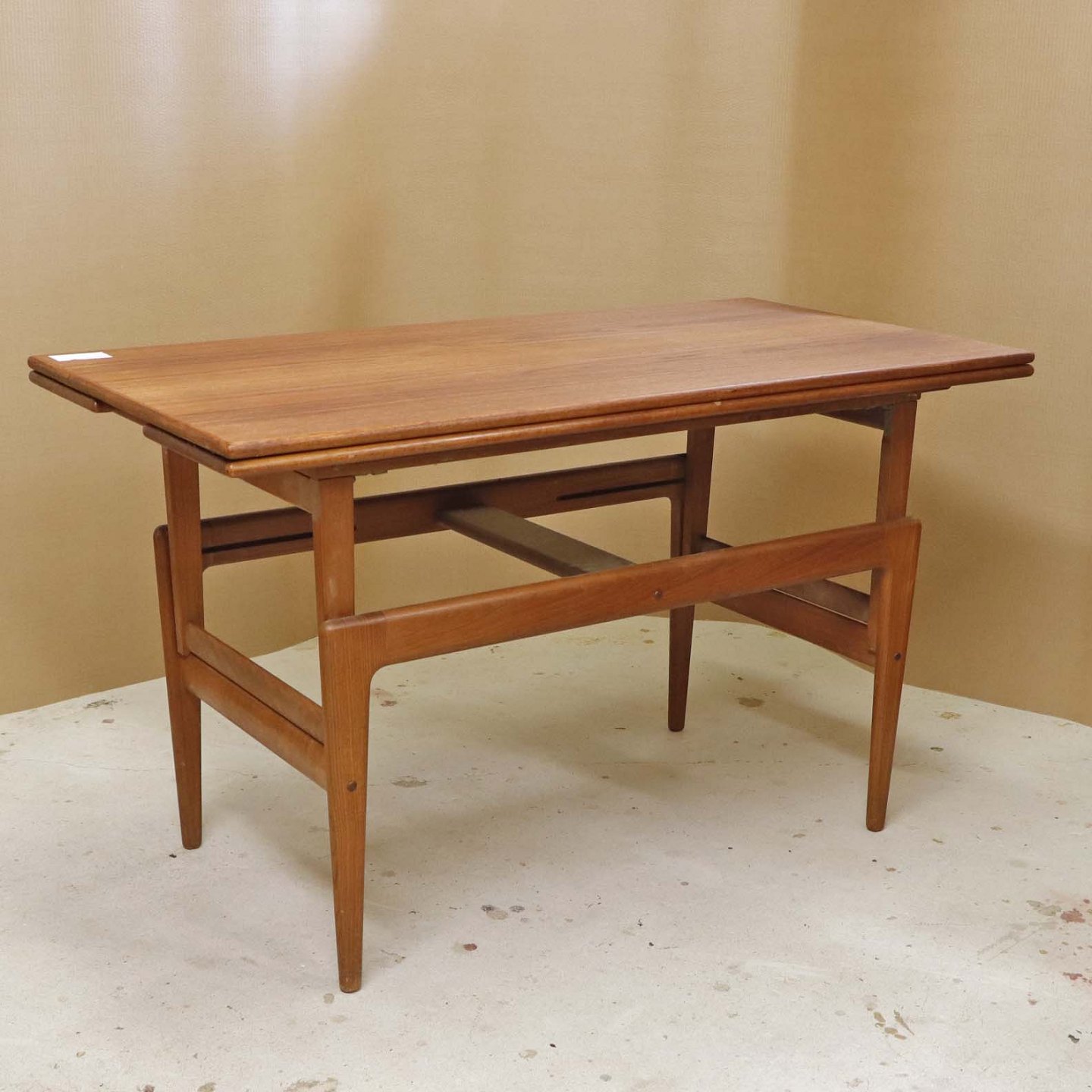 Text available in Danish: Sofa- og spisebord i samme møbel. Bordet er fremstillet i teaktræ og har to underliggende udtræksplader, som befinder sig på hver af bordets lang-sider.