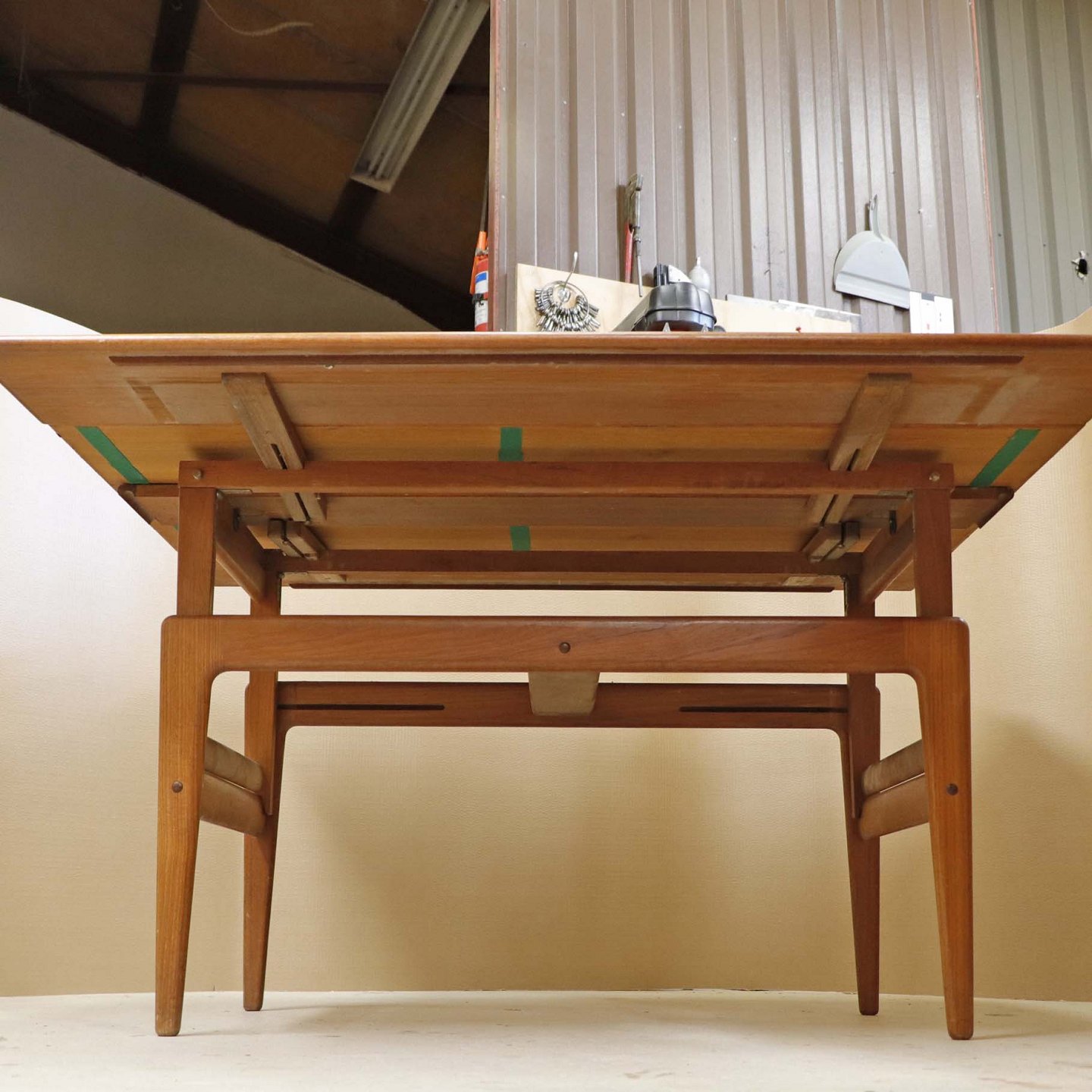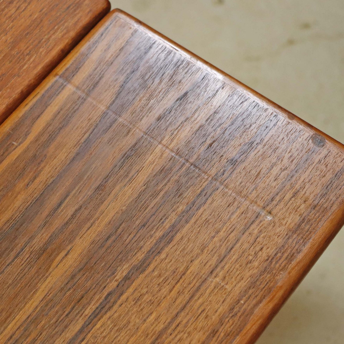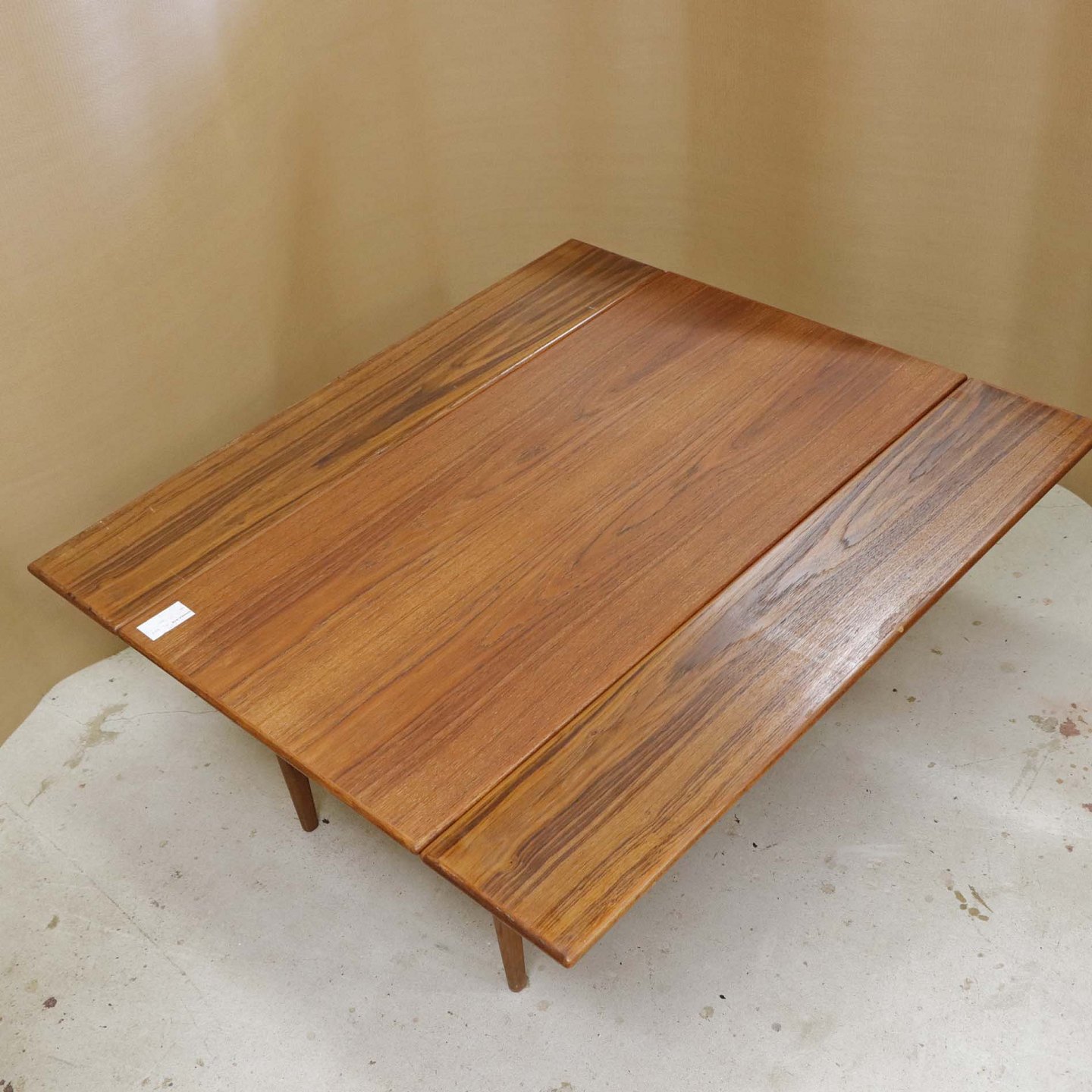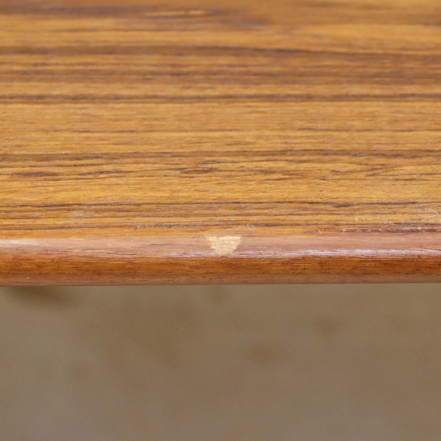 Text available in Danish: Sofa- og spisebord i samme møbel. Bordet er fremstillet i teaktræ og har to underliggende udtræksplader, som befinder sig på hver af bordets lang-sider.