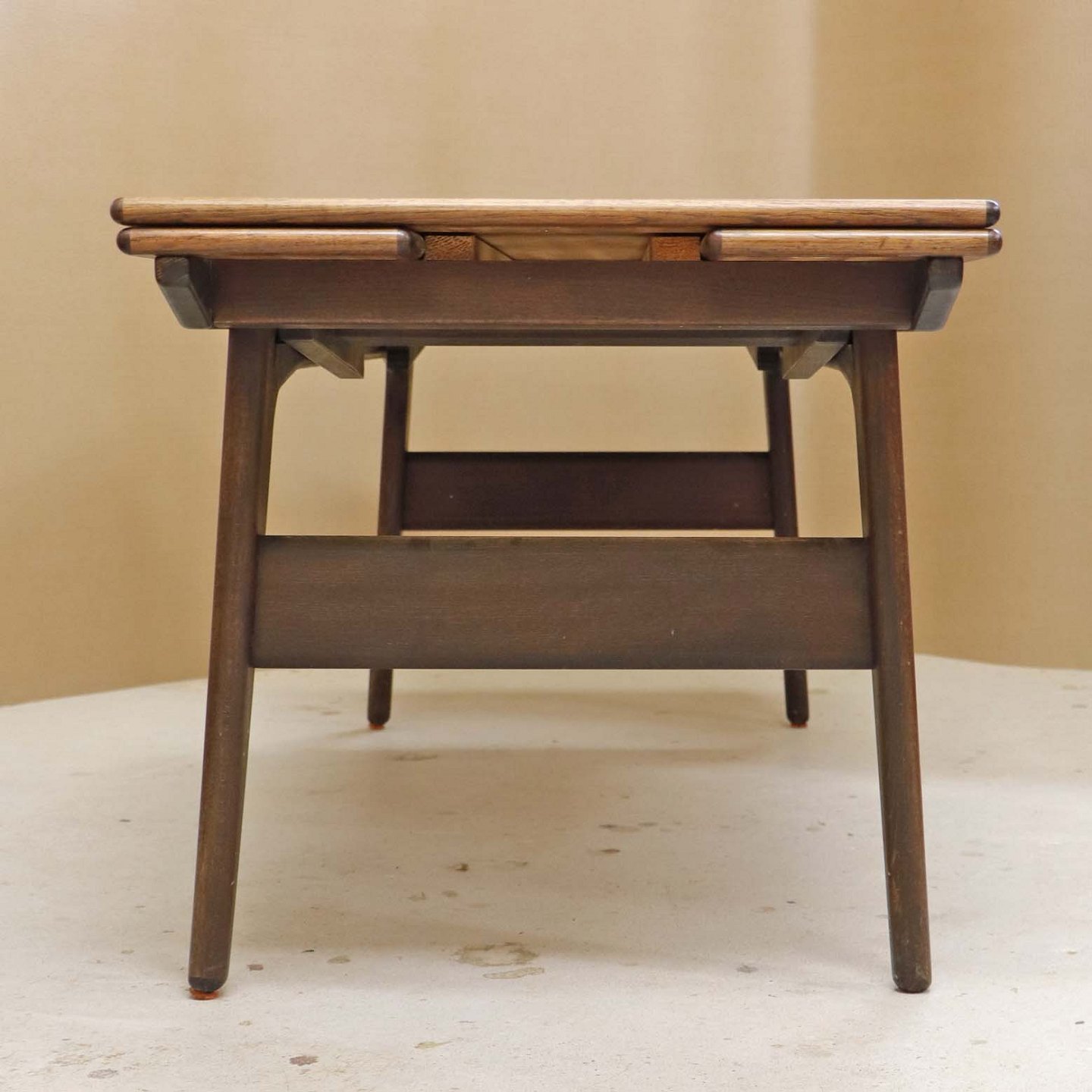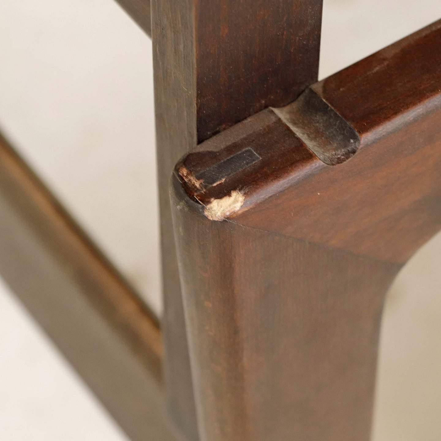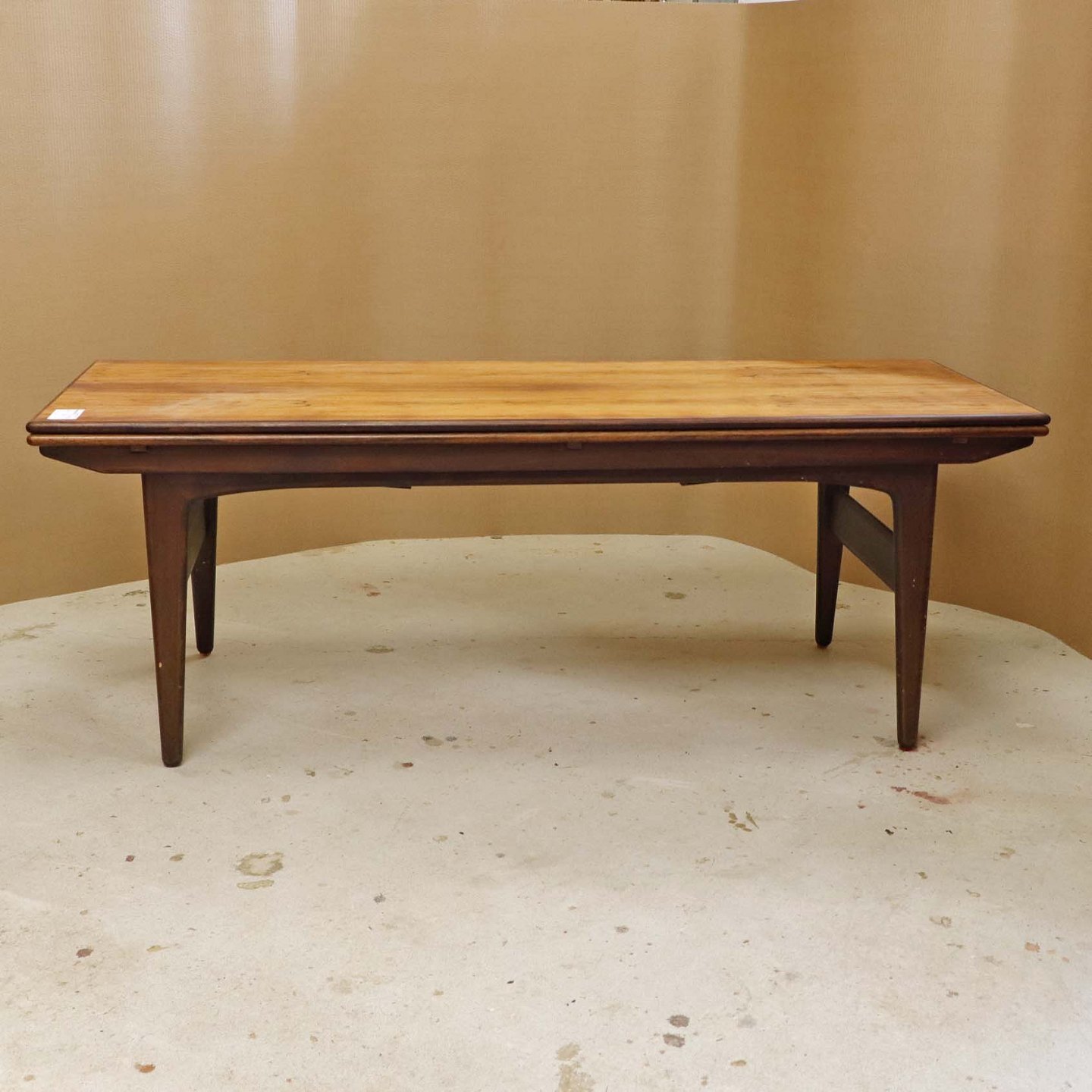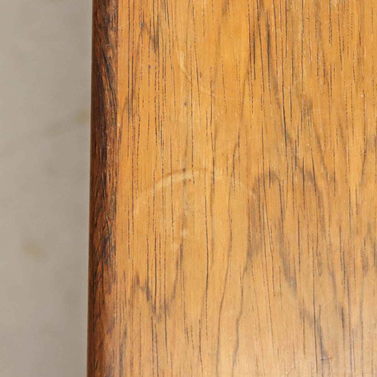Fremstår med ridser på toppladen, vandmærker på udtrækspladen samt to mindre afslag på stellets topkant samt på et enkelt bordben.