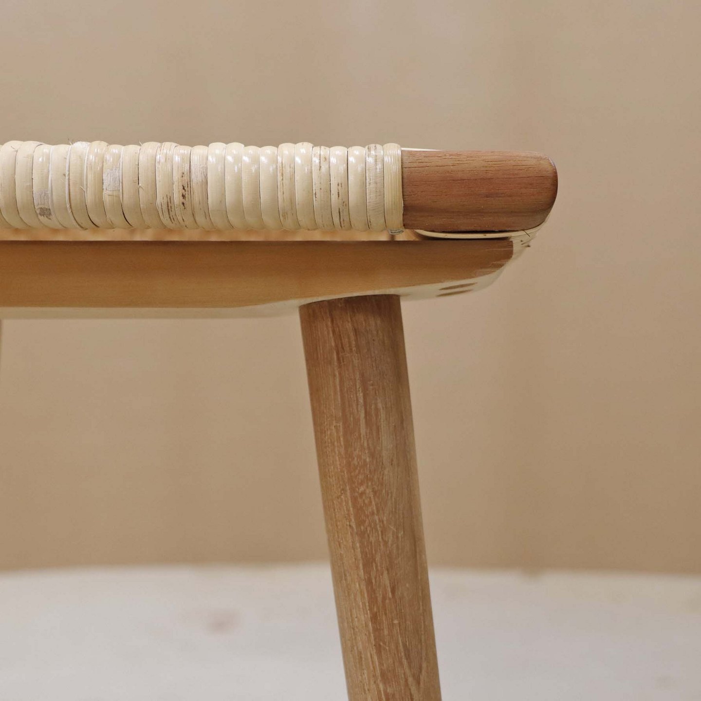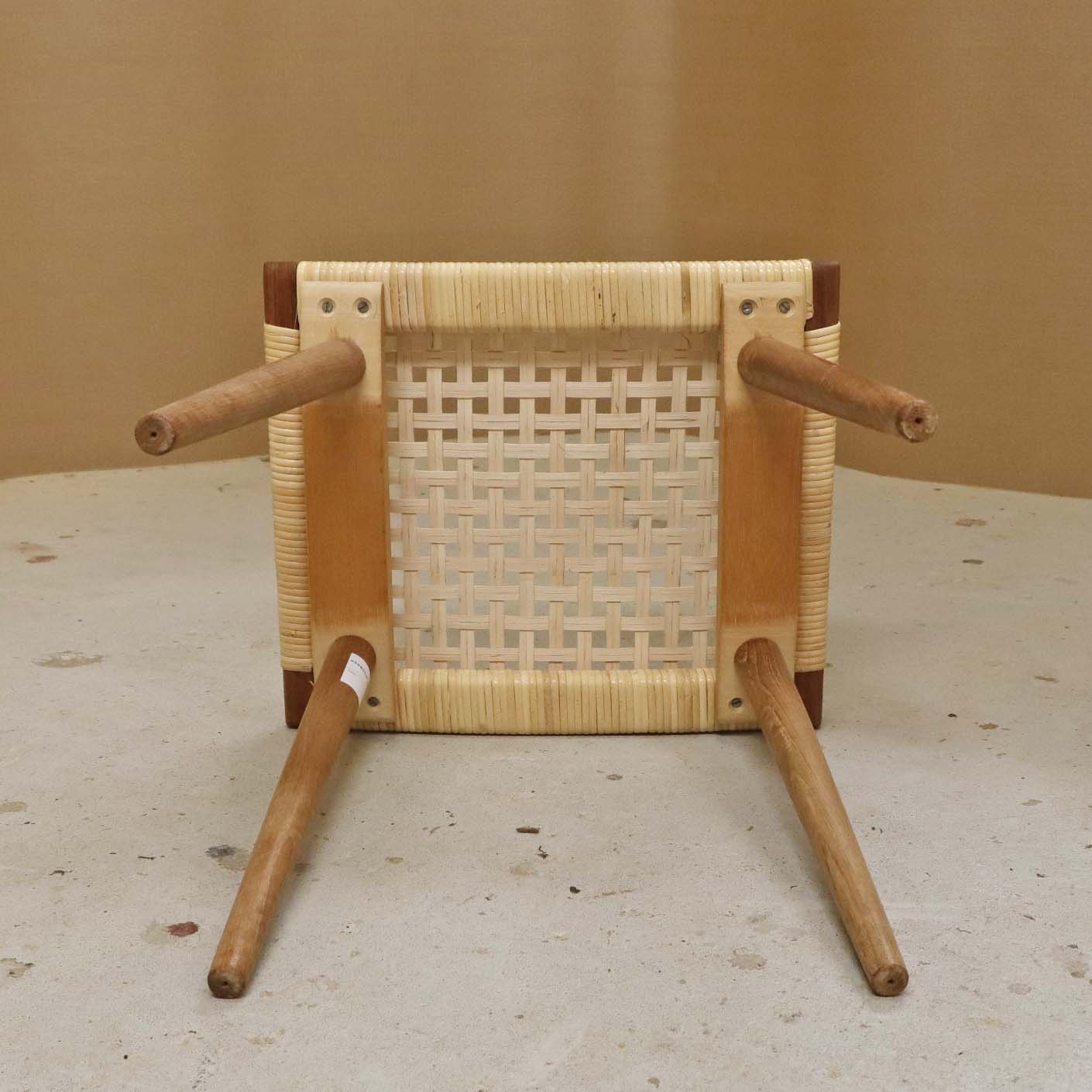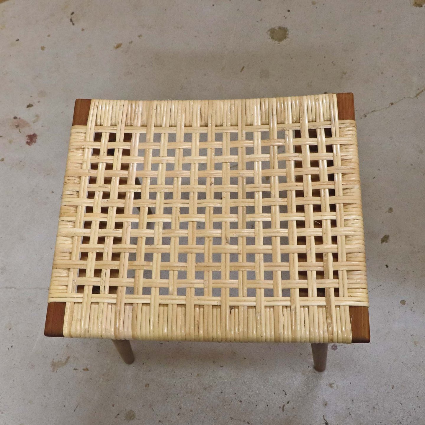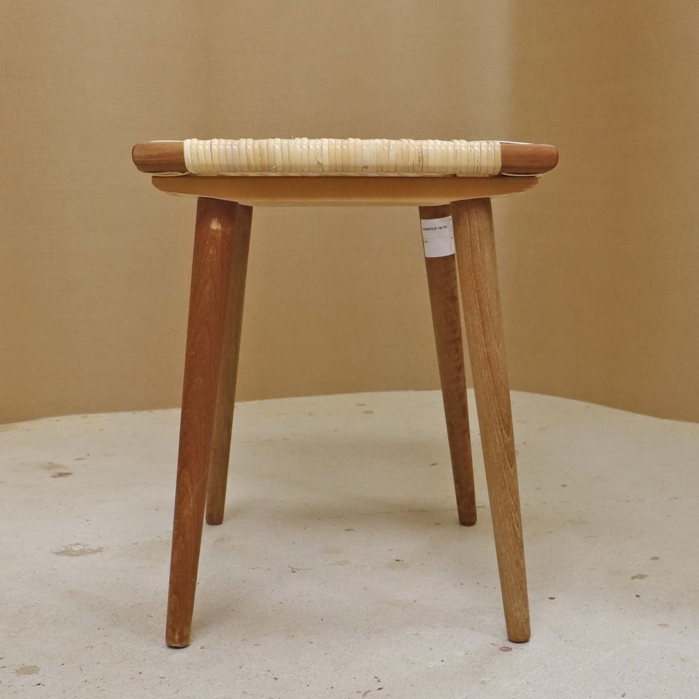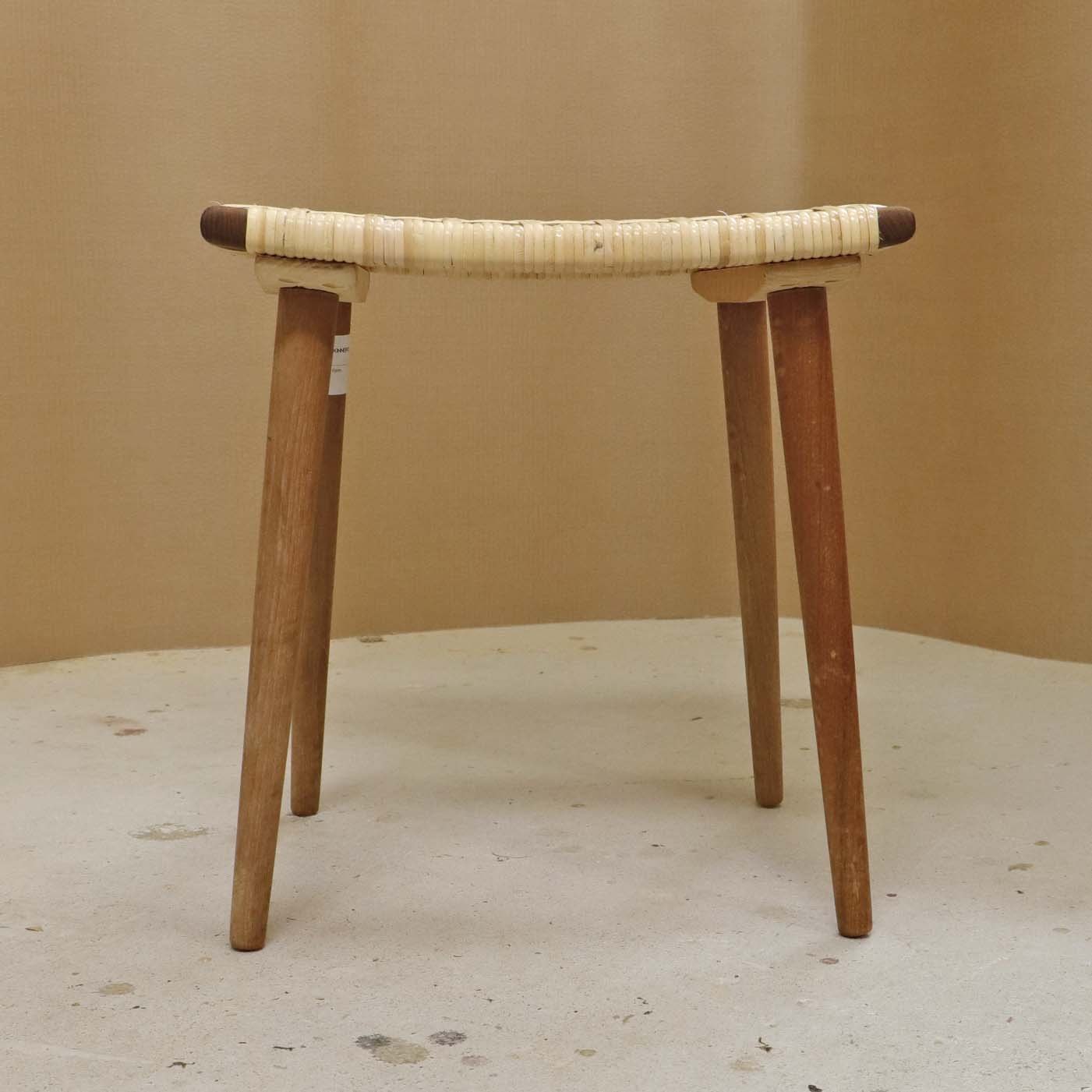 Lille skammel med stel i teaktræ og sæde i ny rørflettet bambus.
