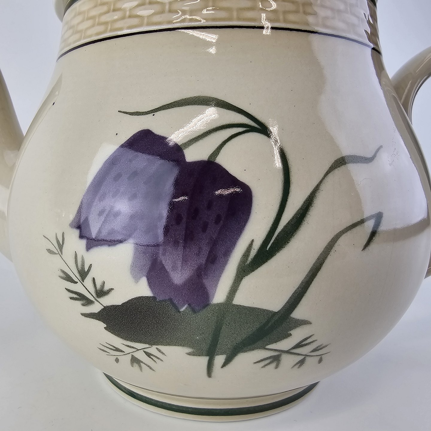 Fajancestel i stelform Viktoria II (Fletværk) med flettet kant og dekoration af en vibeæg blomst i violet og grøn, fremstillet i perioden 1934-1967