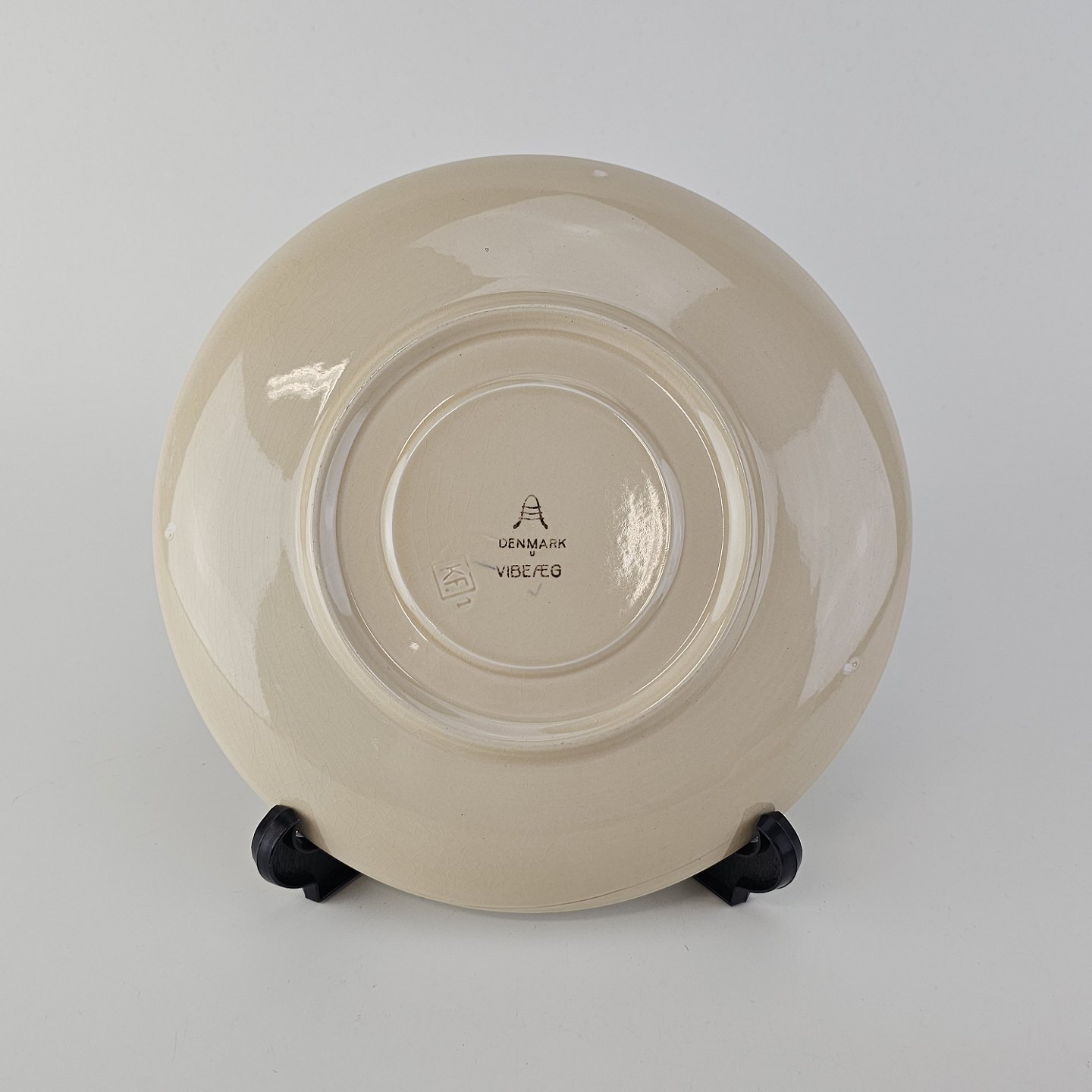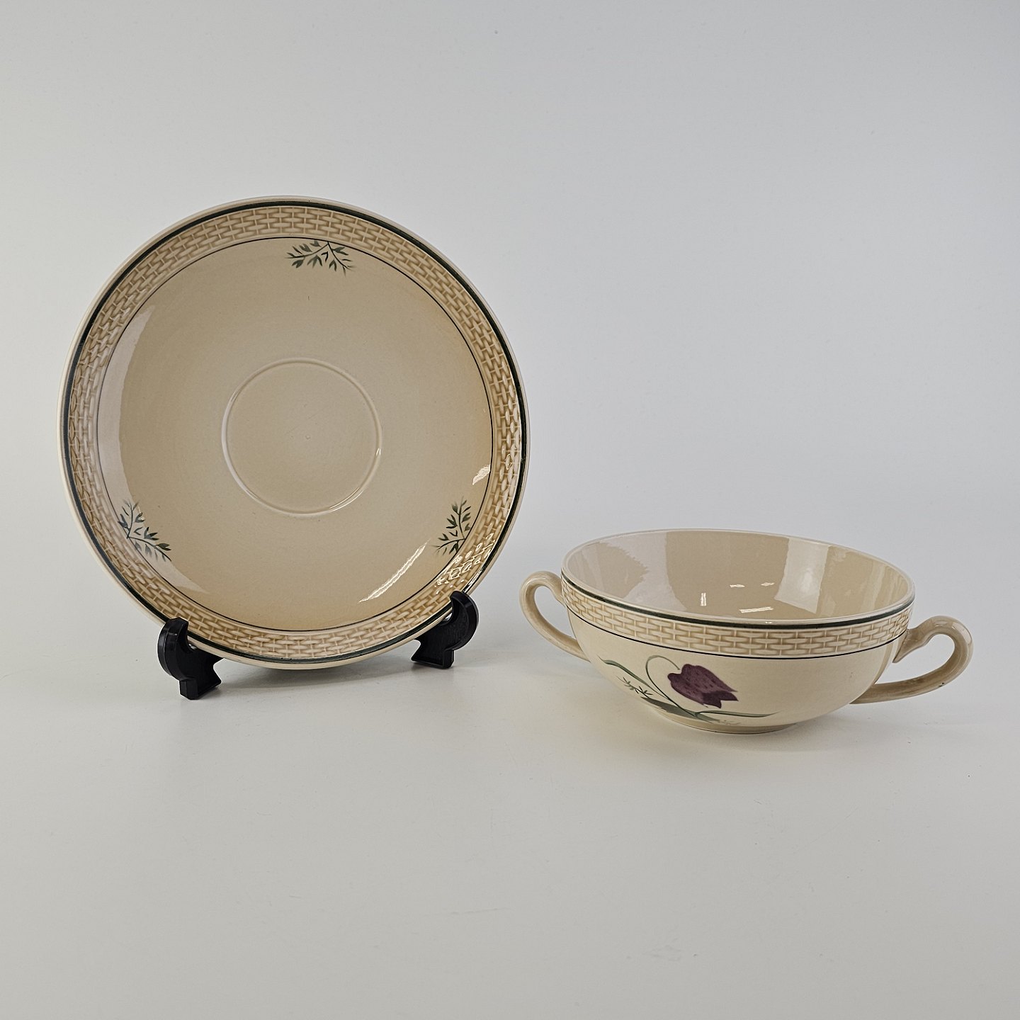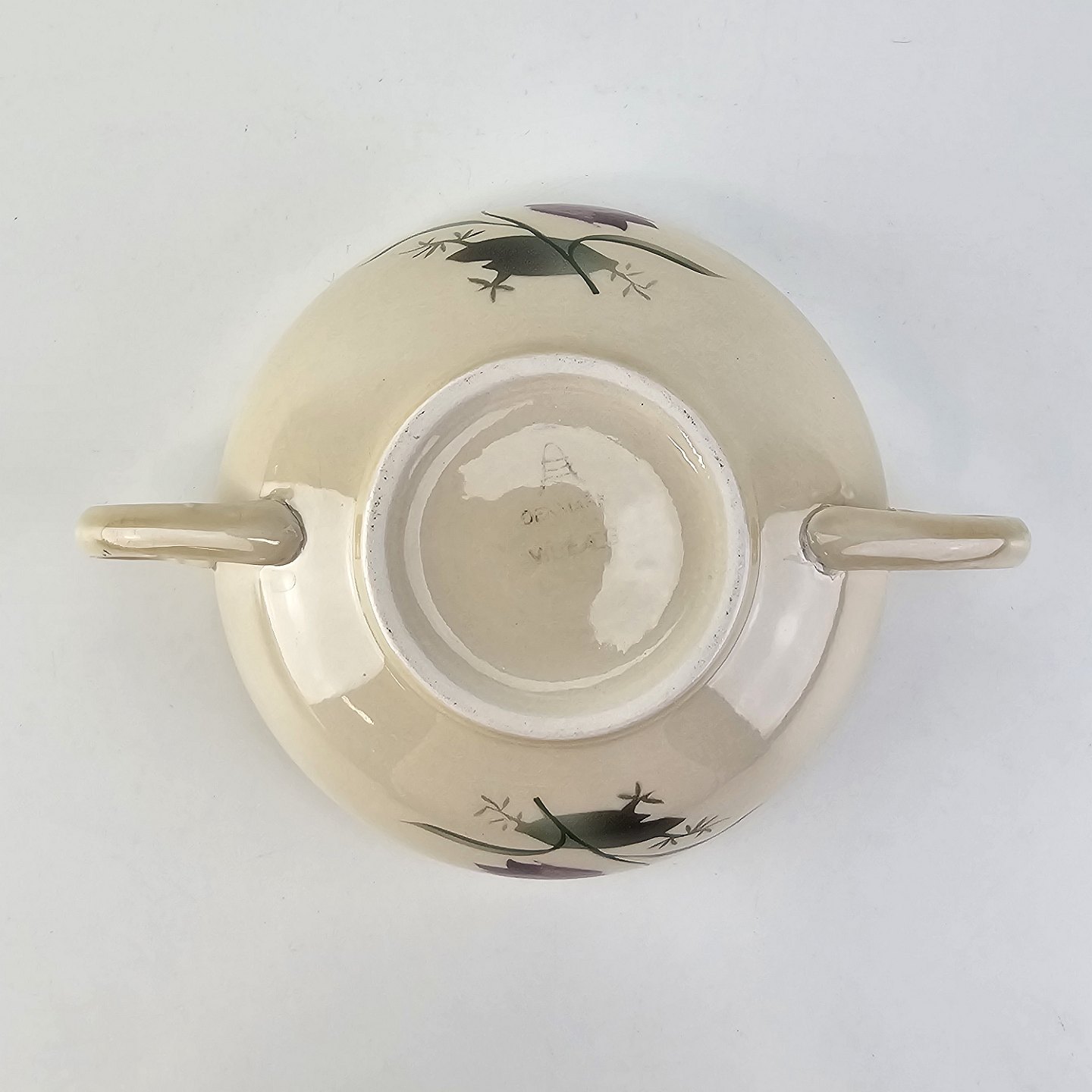Fajancestel i stelform Viktoria II (Fletværk) med flettet kant og dekoration af en vibeæg blomst i violet og grøn, fremstillet i perioden 1934-1967