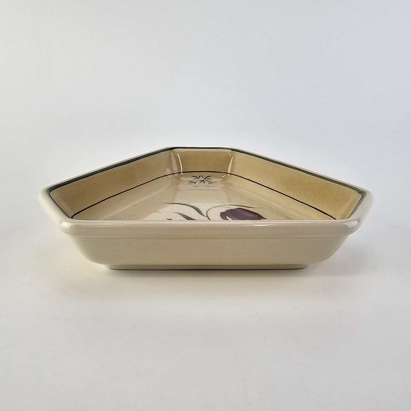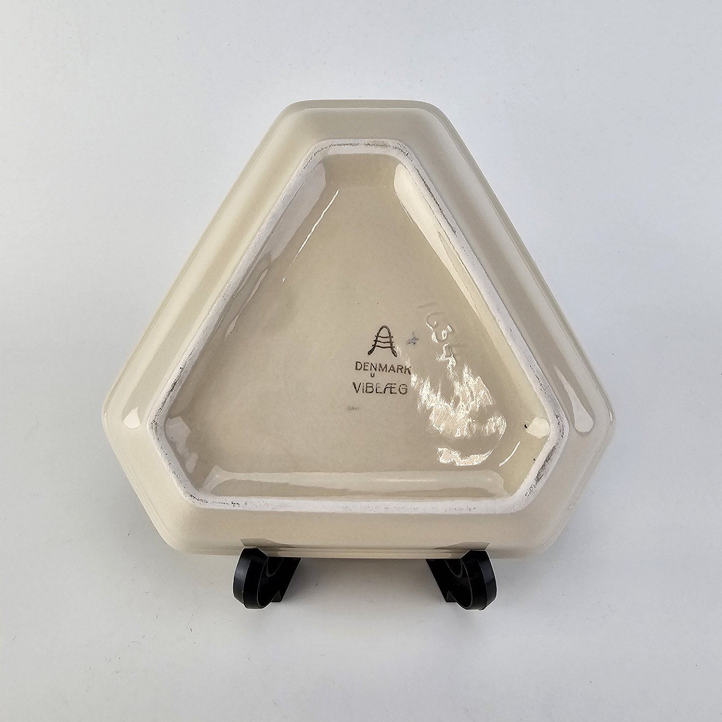 Fajancestel i stelform Viktoria II (Fletværk) med flettet kant og dekoration af en vibeæg blomst i violet og grøn, fremstillet i perioden 1934-1967