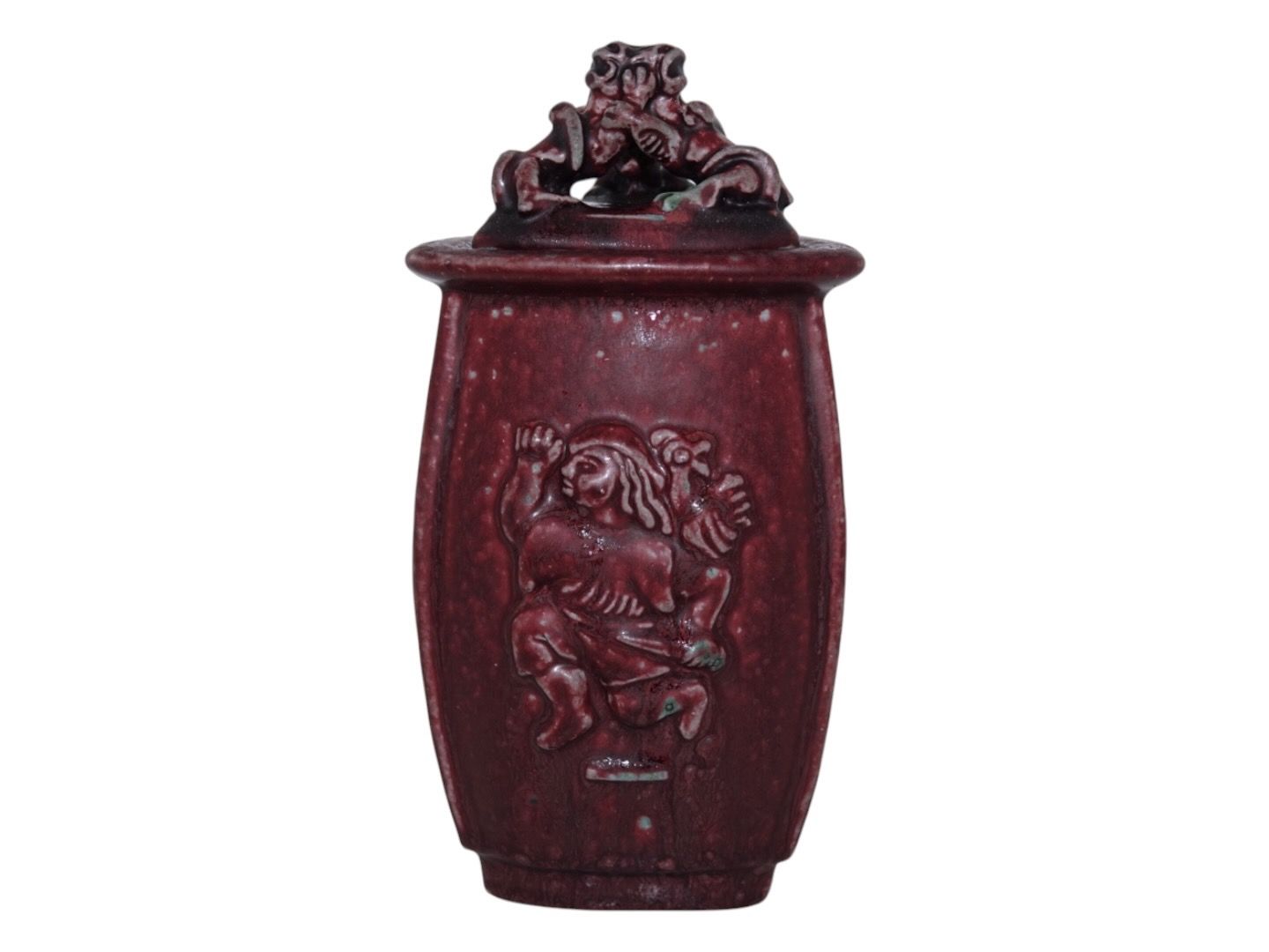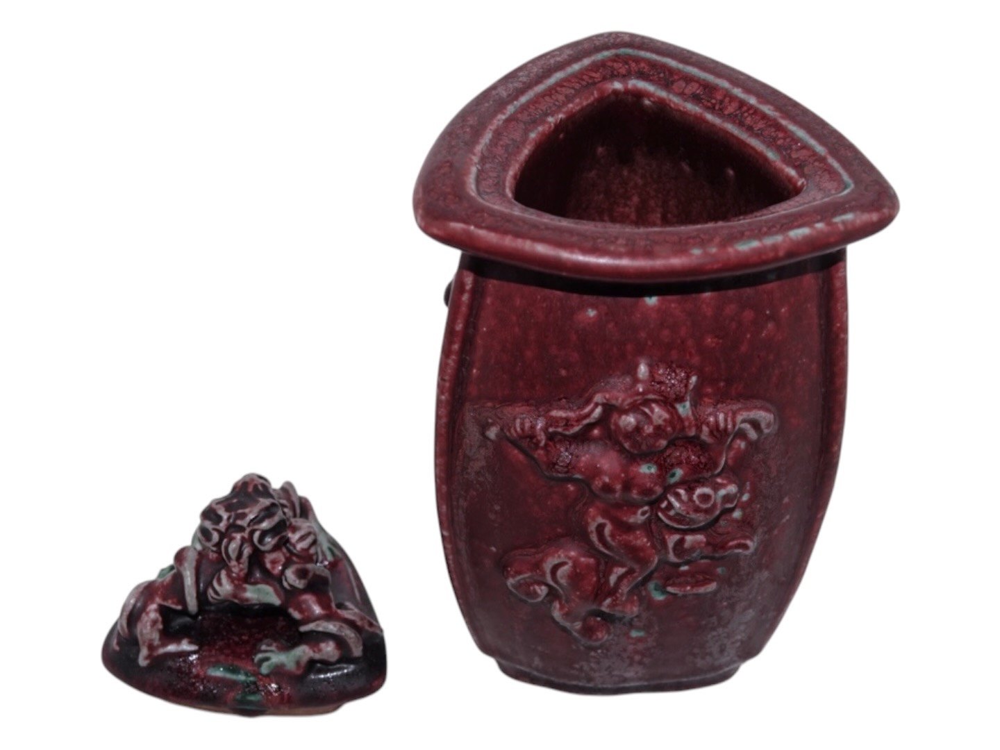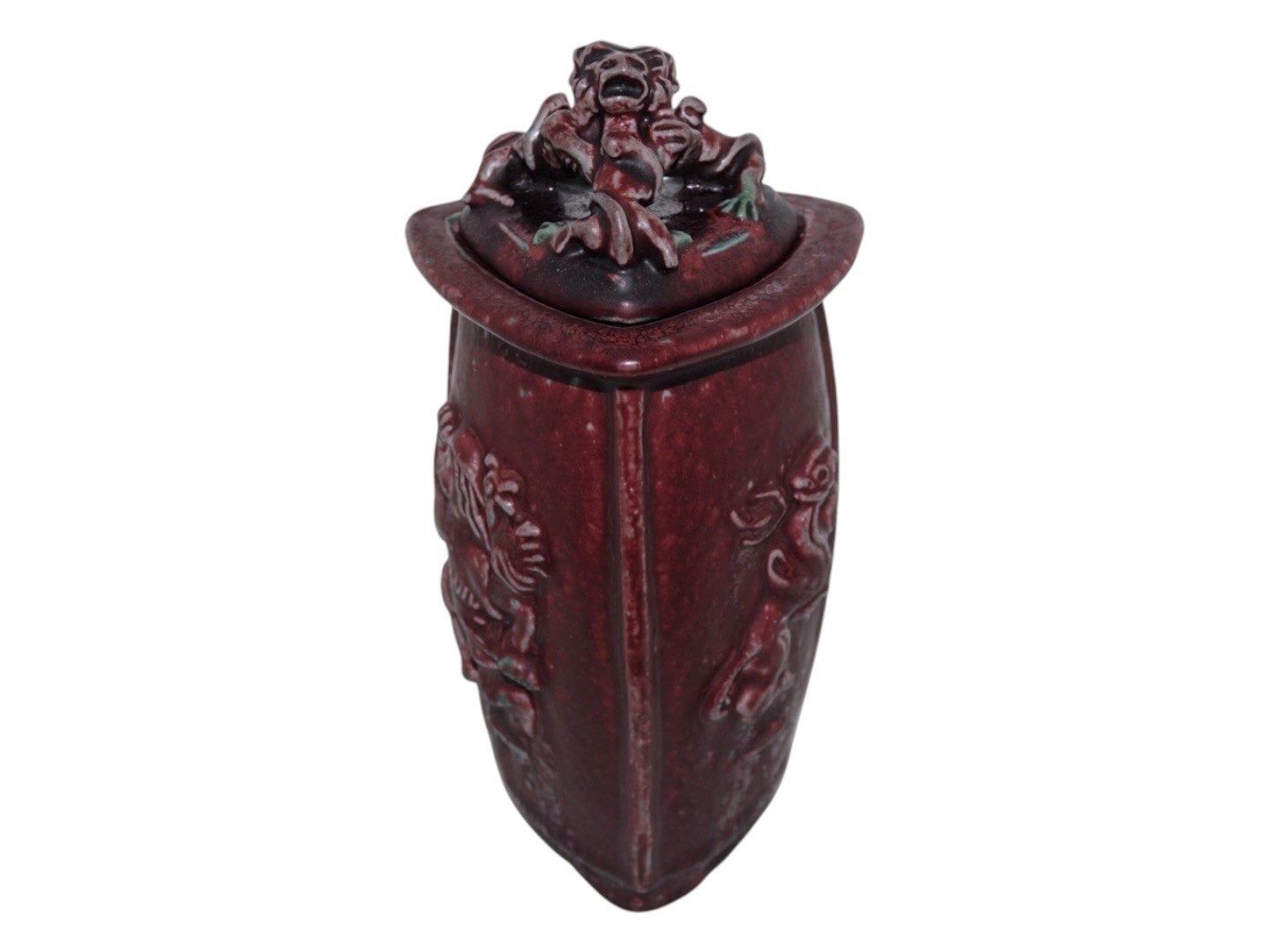 Royal Copenhagen art pottery with red ox blood glaze, triangular lidded vase designed and signed by artist Bode Willumsen.