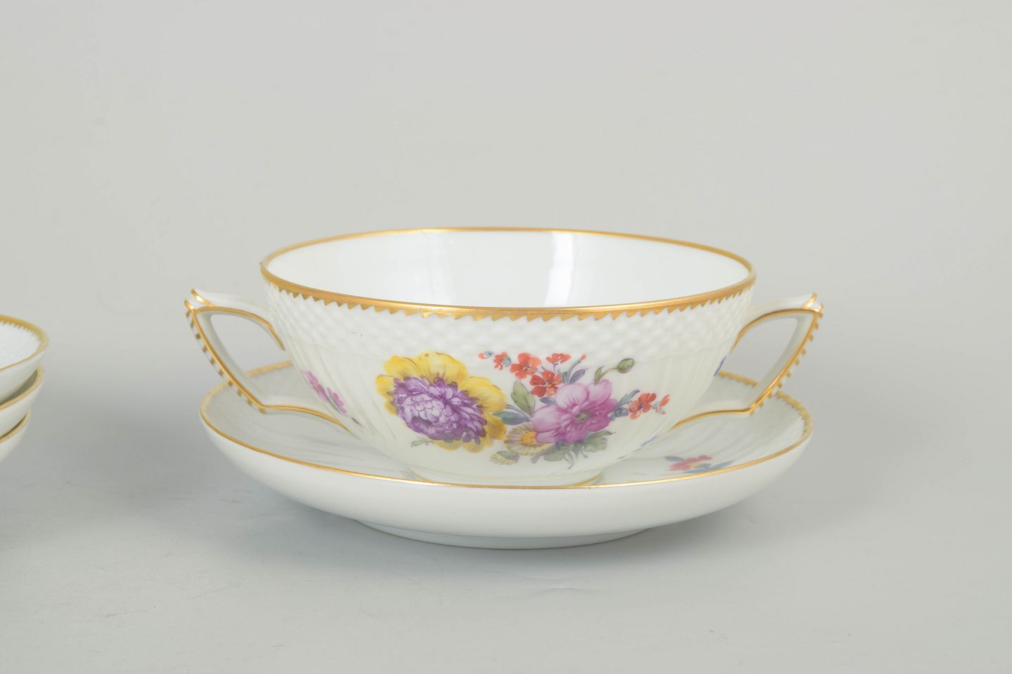 Set of four bouillon cups with matching saucers in porcelain decorated with hand-painted floral motifs in the Saxon flower pattern and finished with a gilded rim. Model 4/1872. First factory quality.