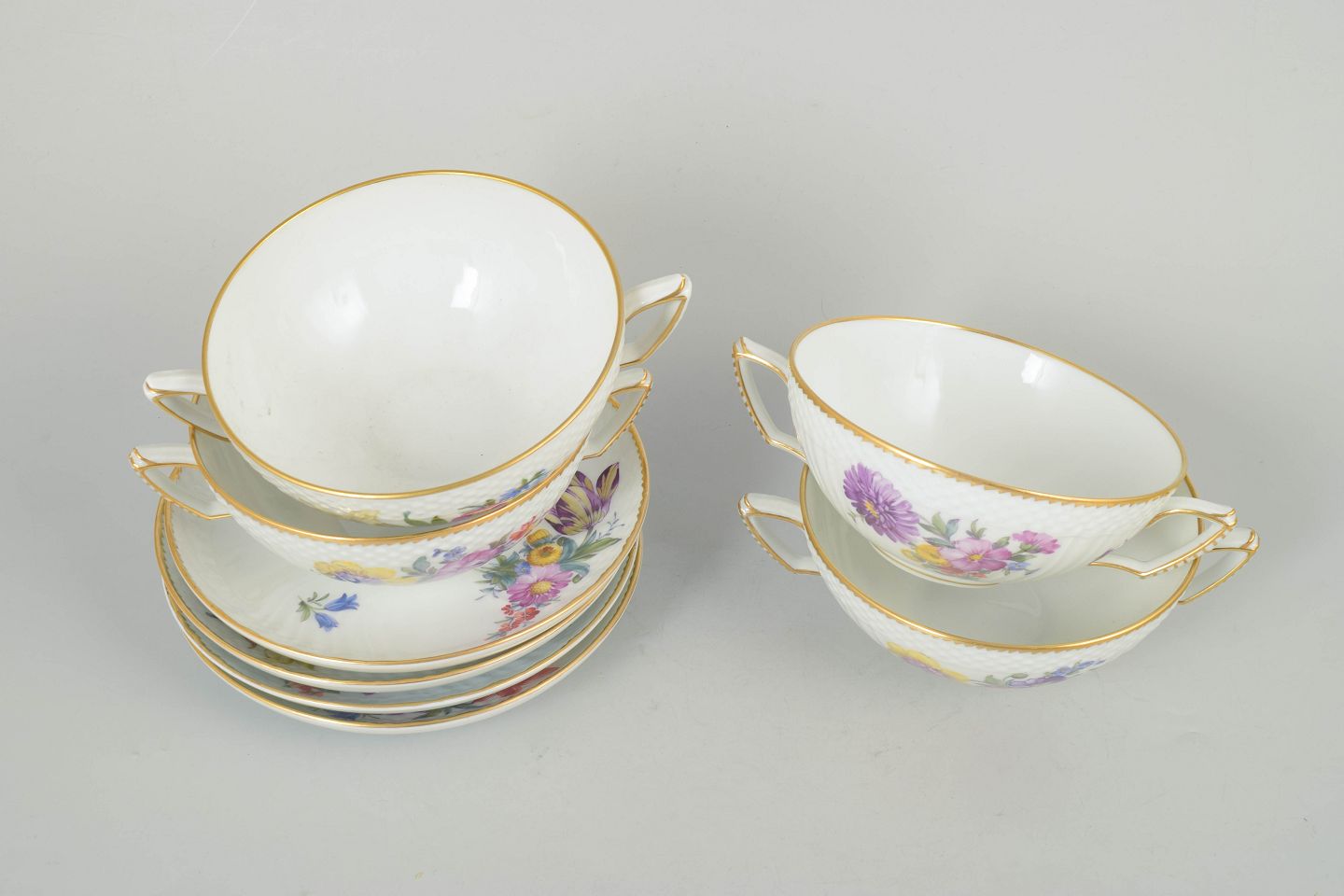 Set of four bouillon cups with matching saucers in porcelain decorated with hand-painted floral motifs in the Saxon flower pattern and finished with a gilded rim. Model 4/1872. First factory quality.
