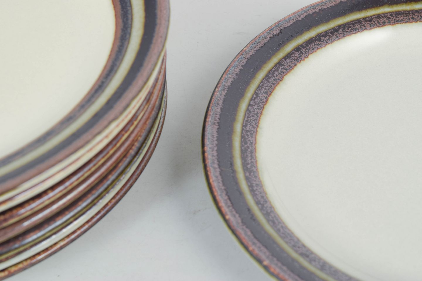 Classic stoneware plates with characteristic striped rim decoration in brown, green and dark tones, Karelia model by Arabia.