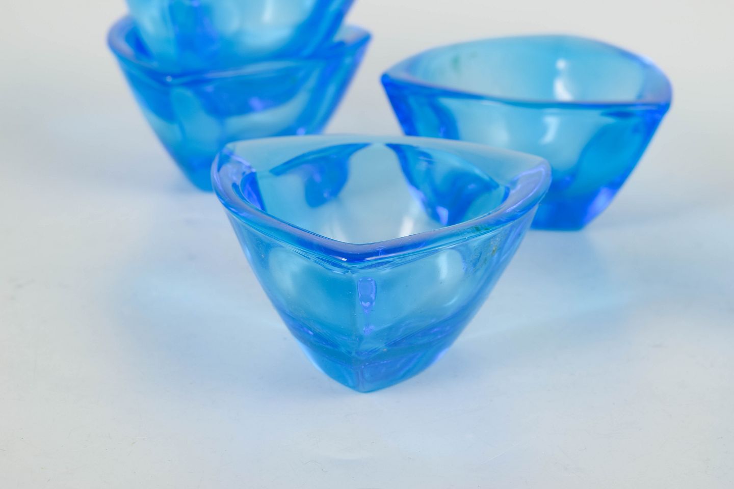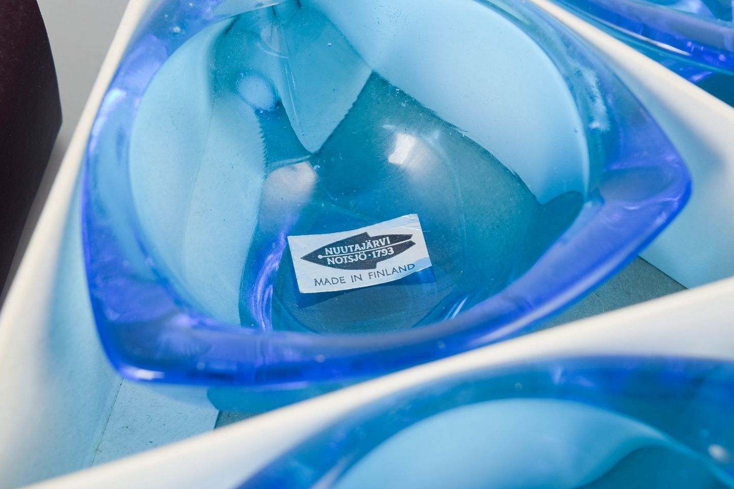 Organically shaped bowls in blue glass, “Bull’s eye” model, with original stickers and box.