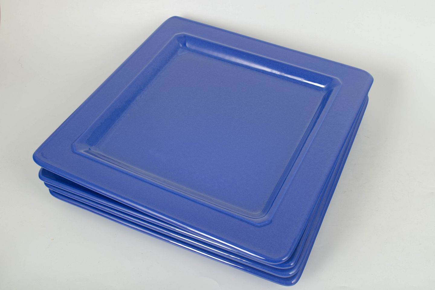 Minimalist set of glazed ceramic consisting of four large square plates in a uniform blue colour with a glossy finish.