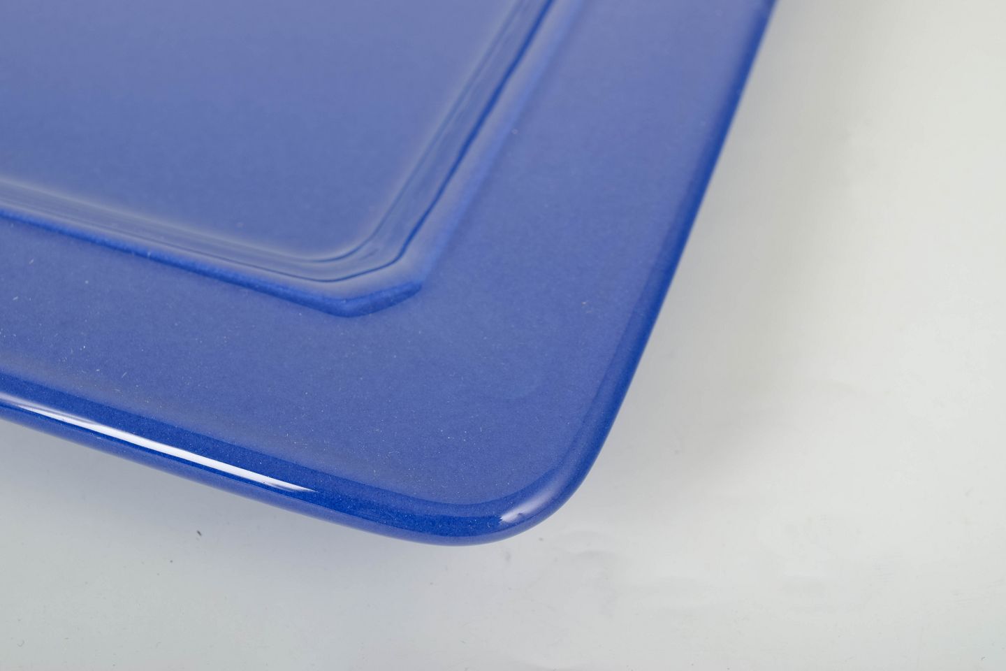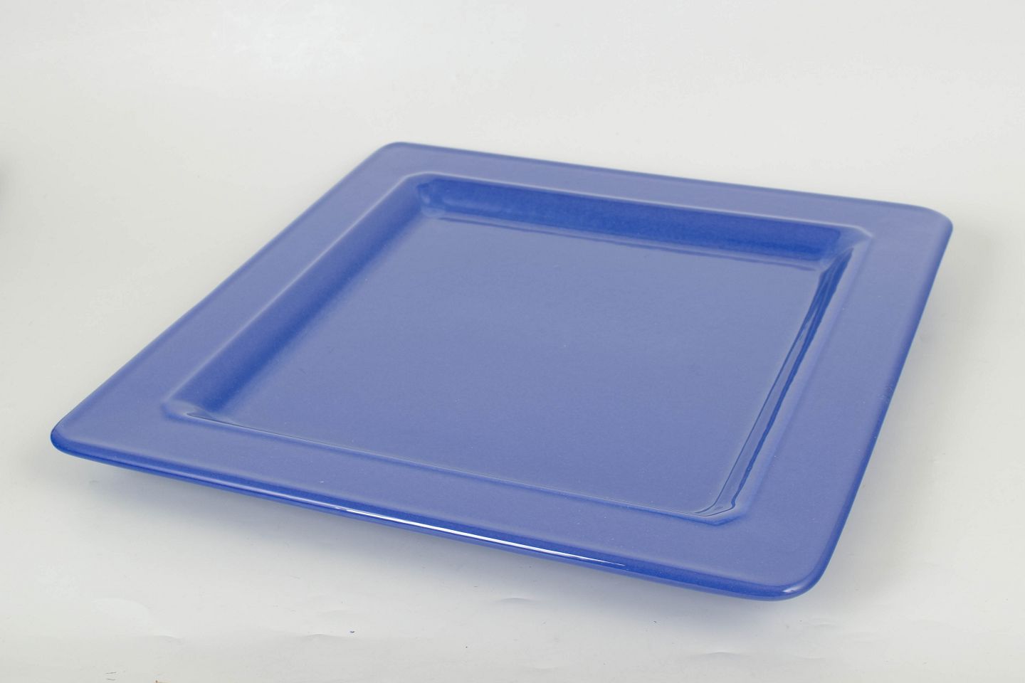 Simple and elegant set of three large square ceramic plates with a uniform deep blue glaze.