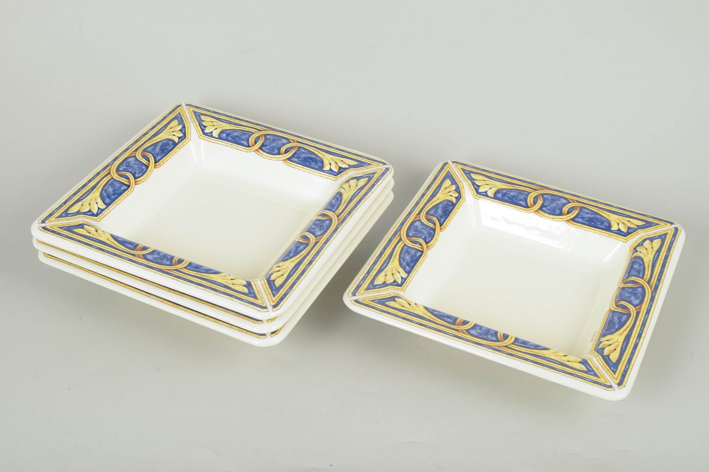 Decorative ceramic set consisting of four dinner plates with a wide border in blue, yellow and gilt tones with ornamental motifs.
