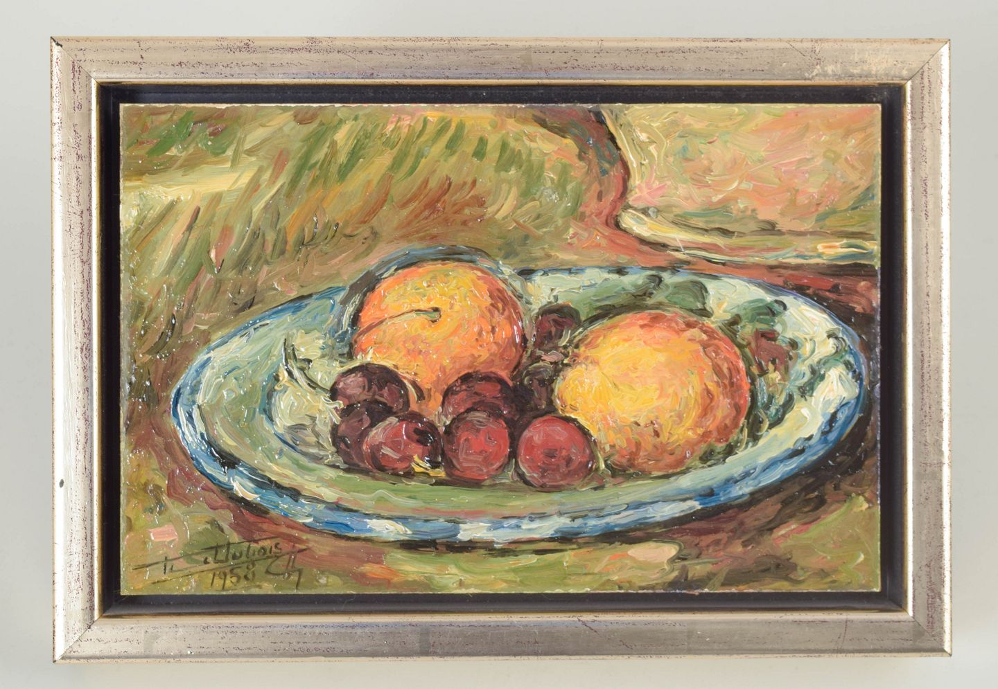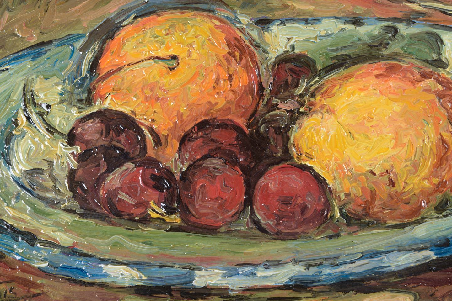 Still life with fruit arranged on a dish, executed with vigorous brushwork and warm, saturated colours in an expressive and slightly abstracted manner.