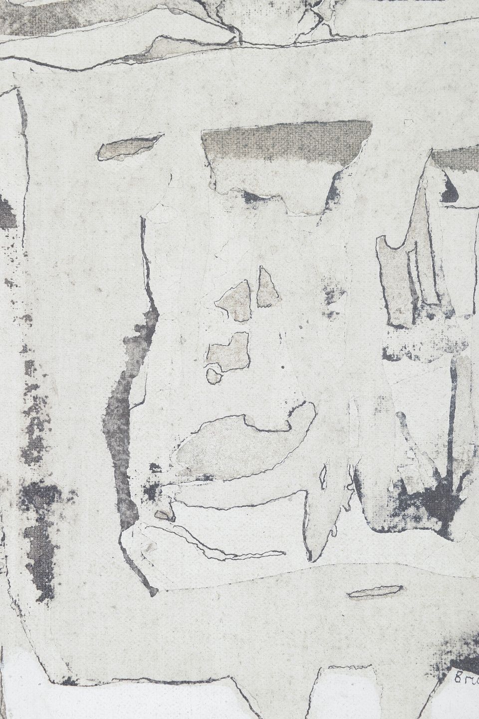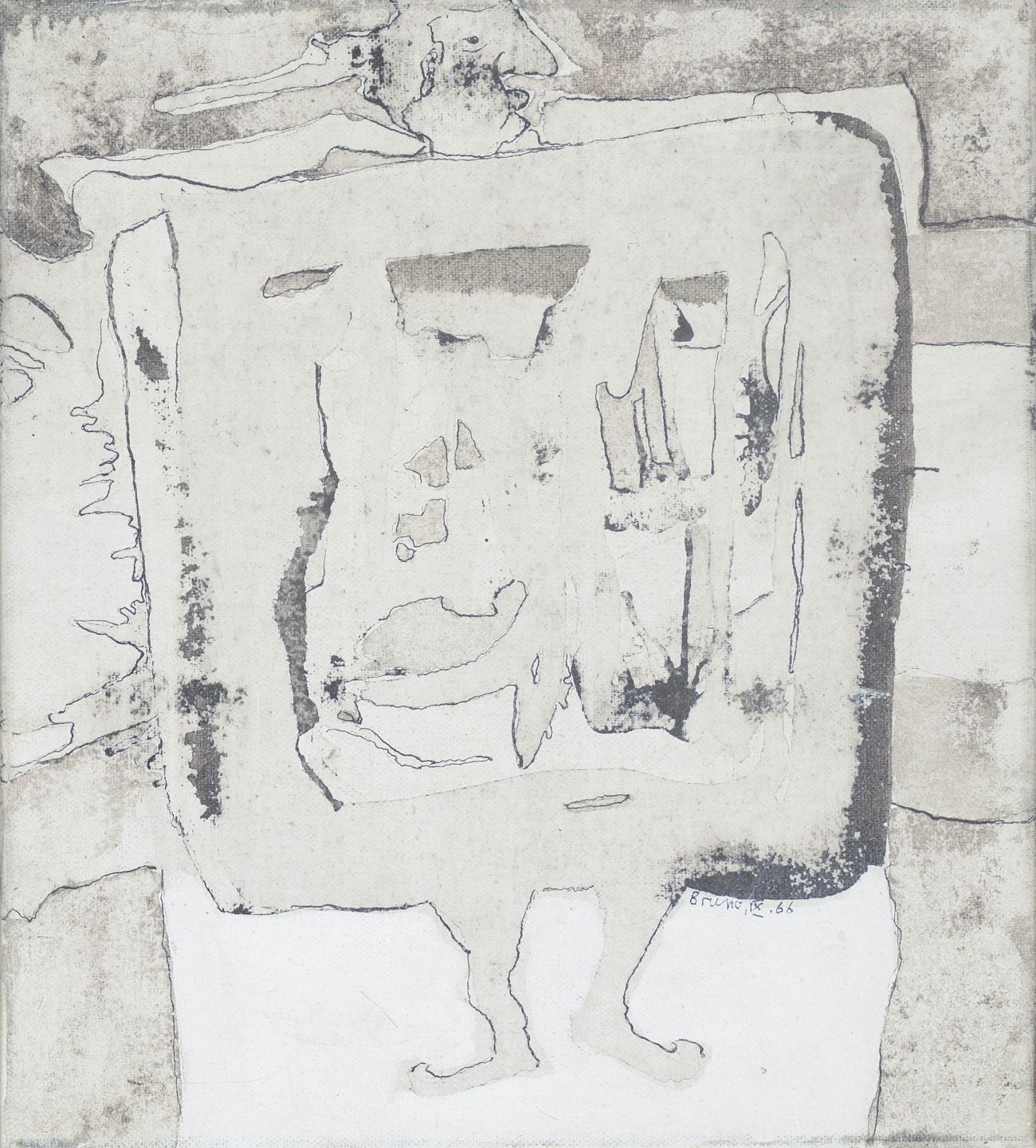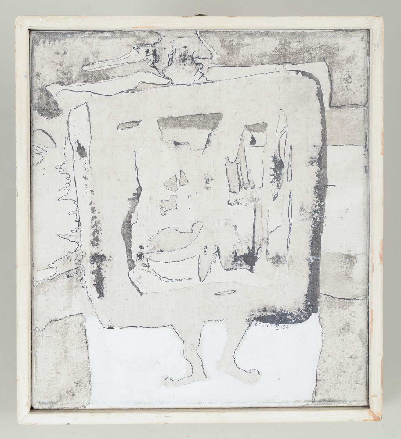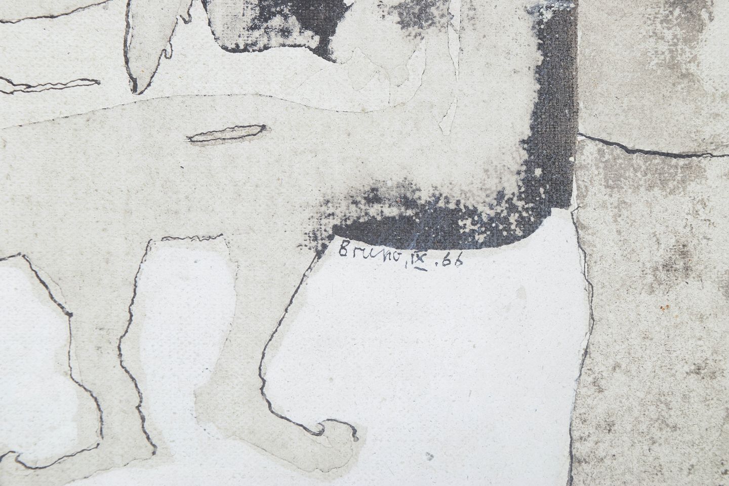 Abstract composition executed in oil on canvas with subdued grey tones and organic forms. Signed Bruno 66.