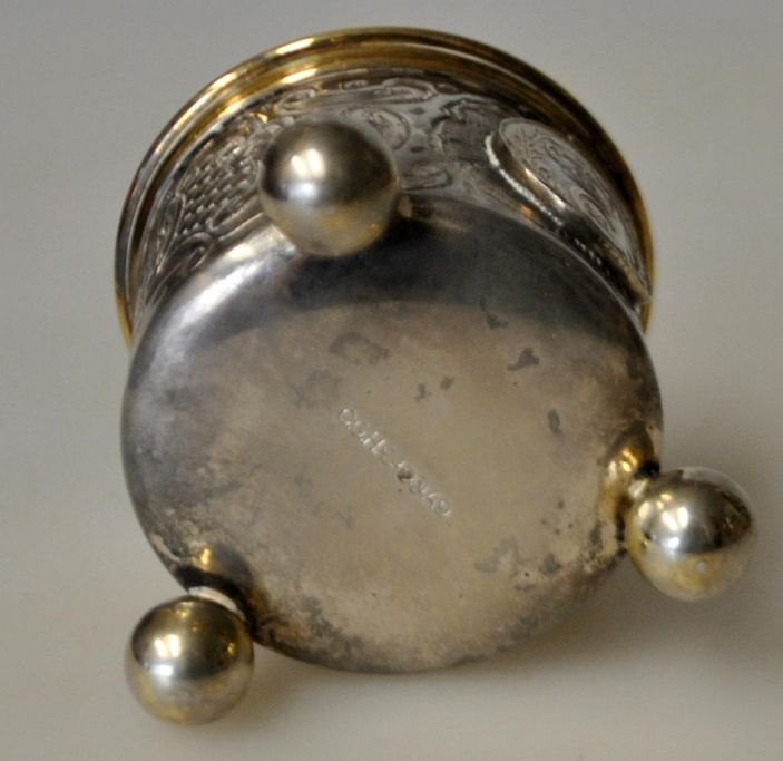 Swedish silver goblet in baroque form, 1951. On three ball feet. The side is decorated with rocailles and two Swedish one-eared coins from 1694 and 1722 respectively. Inside is gilded. Stamped. H.: 4 cm. Dia.: 4.5 cm.