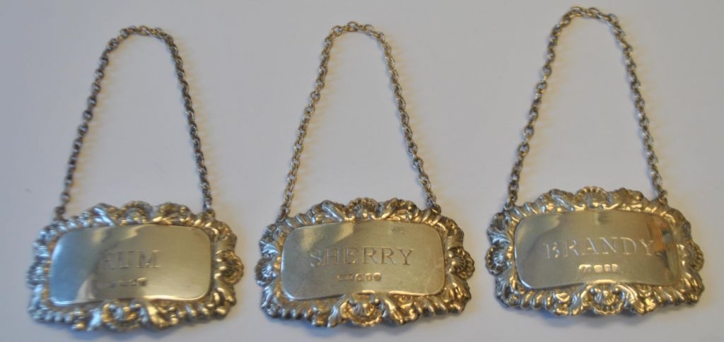 Silver wine signs, 19th century England. Signs for Rum, Sherry and Cognac. Stamped. With chain and edge decoration. 4 x 6.2 cm.