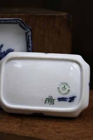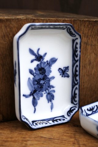Rare small antique Blue Flower asiet with the classic blue flower motif and small flying insect. Decoration number: 10/8733. from the year 1898-1923. H: 1.8cm. 9.5 x 6.5cm.