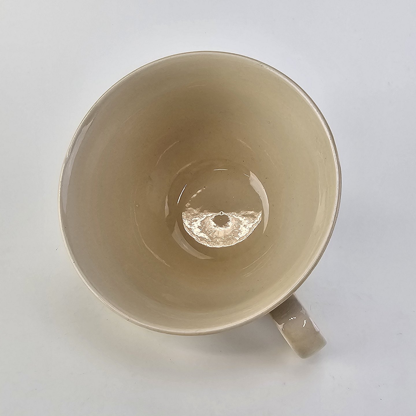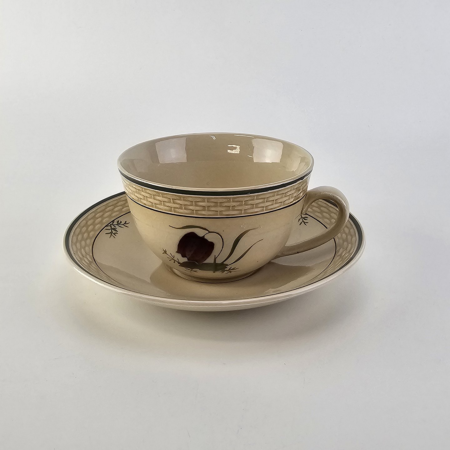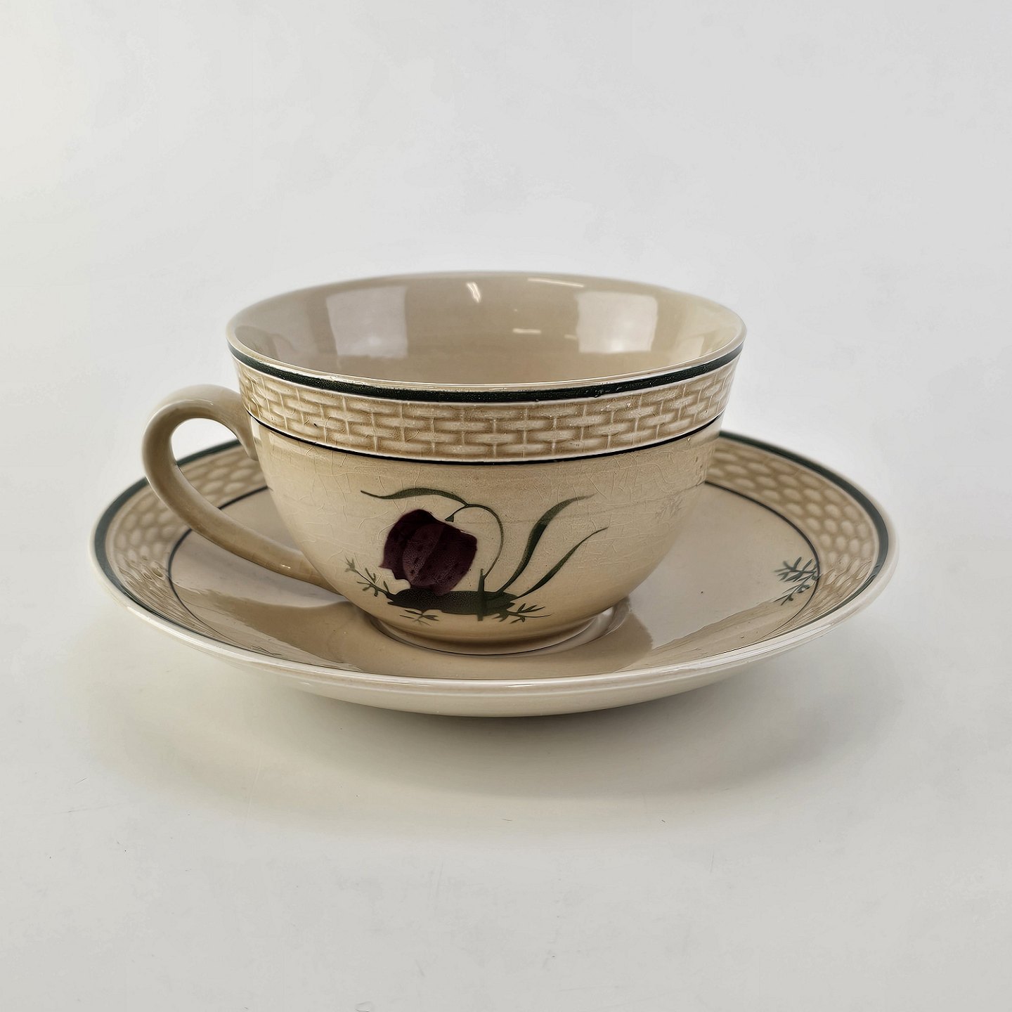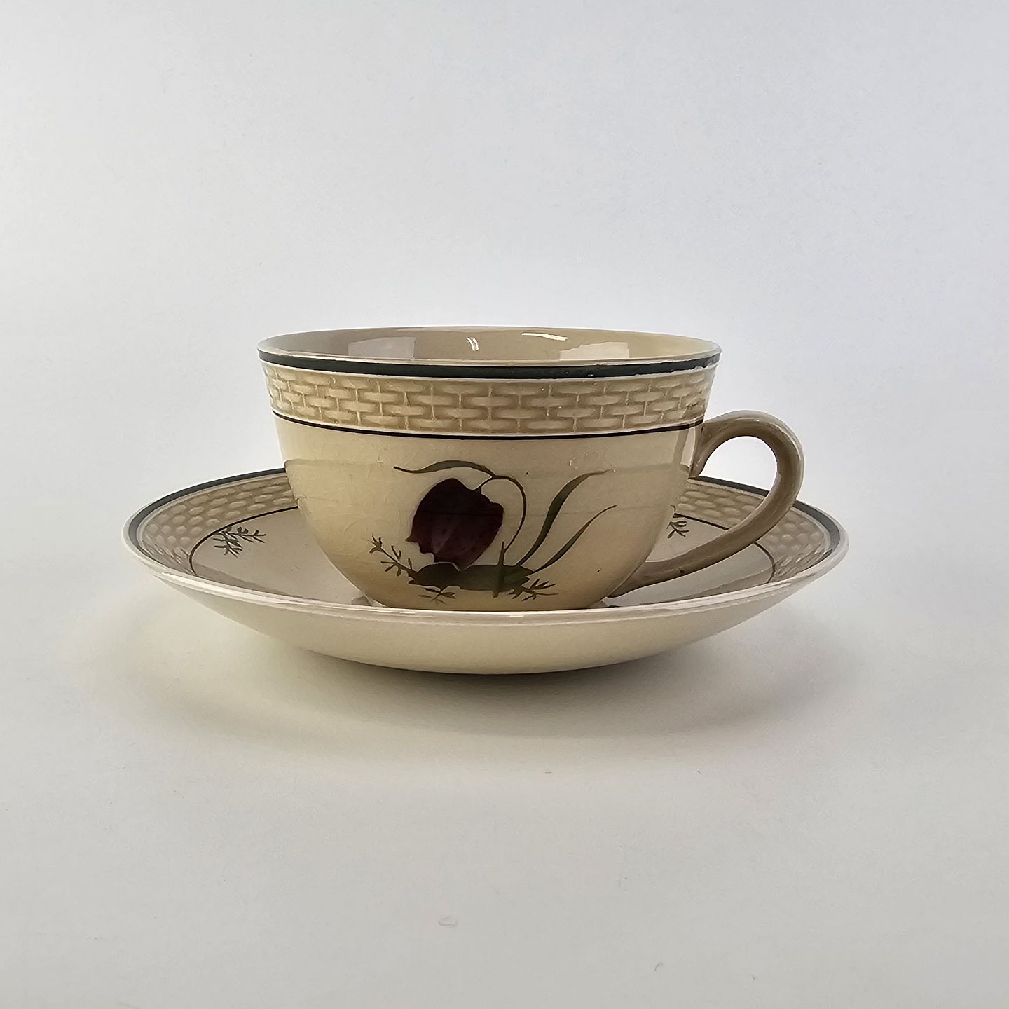Fajancestel i stelform Viktoria II (Fletværk) med flettet kant og dekoration af en vibeæg blomst i violet og grøn, fremstillet i perioden 1934-1967