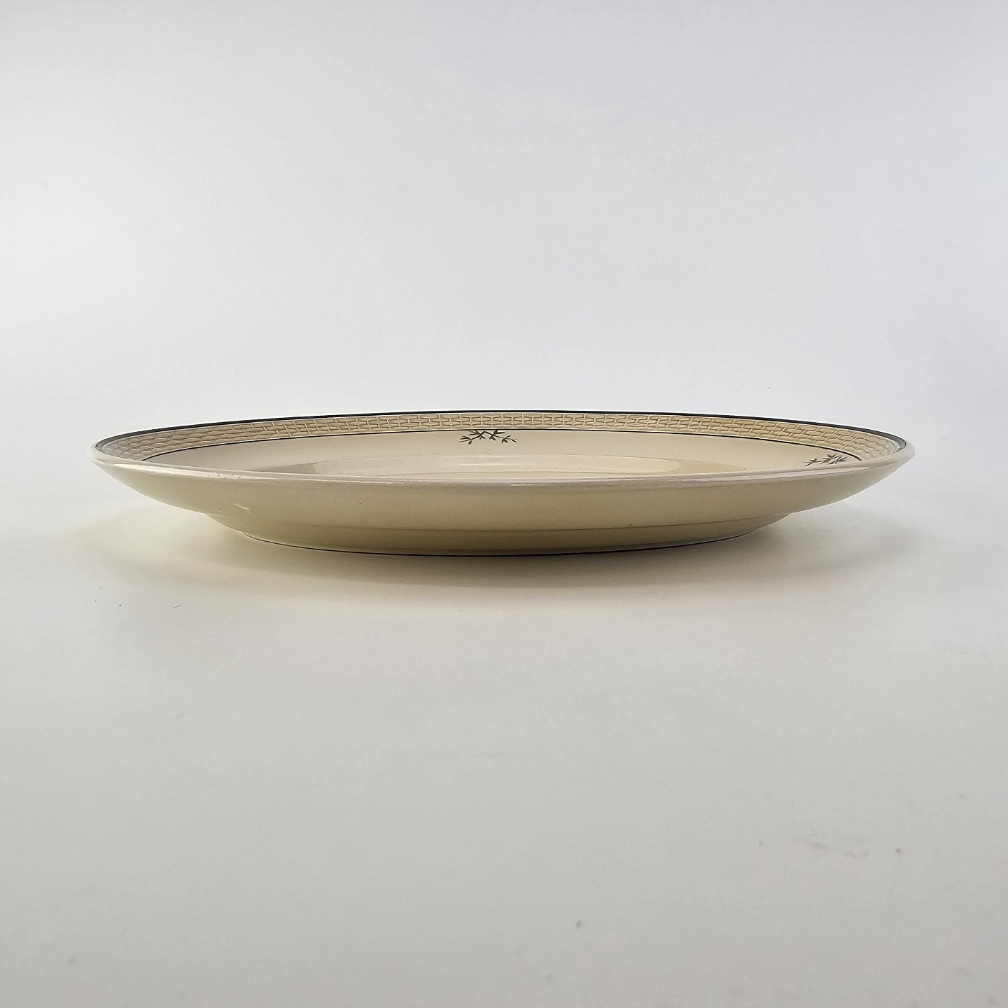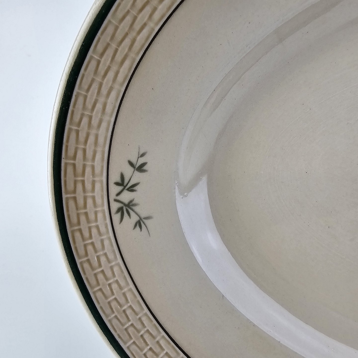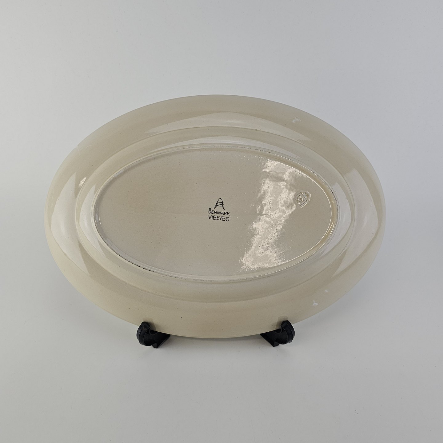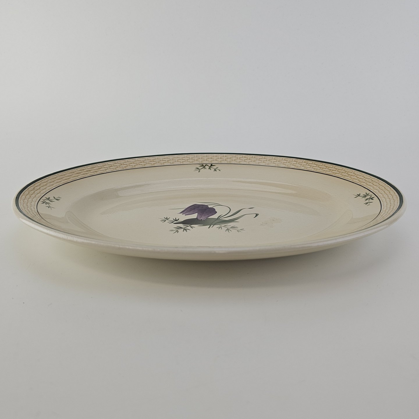 Fajancestel i stelform Viktoria II (Fletværk) med flettet kant og dekoration af en vibeæg blomst i violet og grøn, fremstillet i perioden 1934-1967