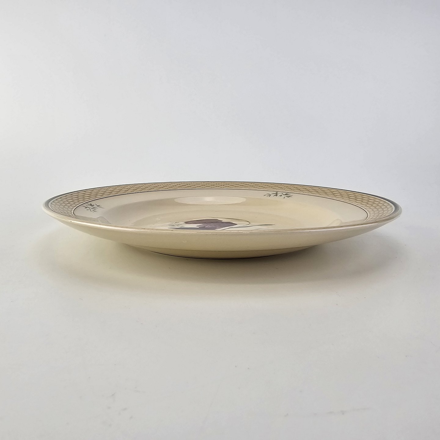 Fajancestel i stelform Viktoria II (Fletværk) med flettet kant og dekoration af en vibeæg blomst i violet og grøn, fremstillet i perioden 1934-1967