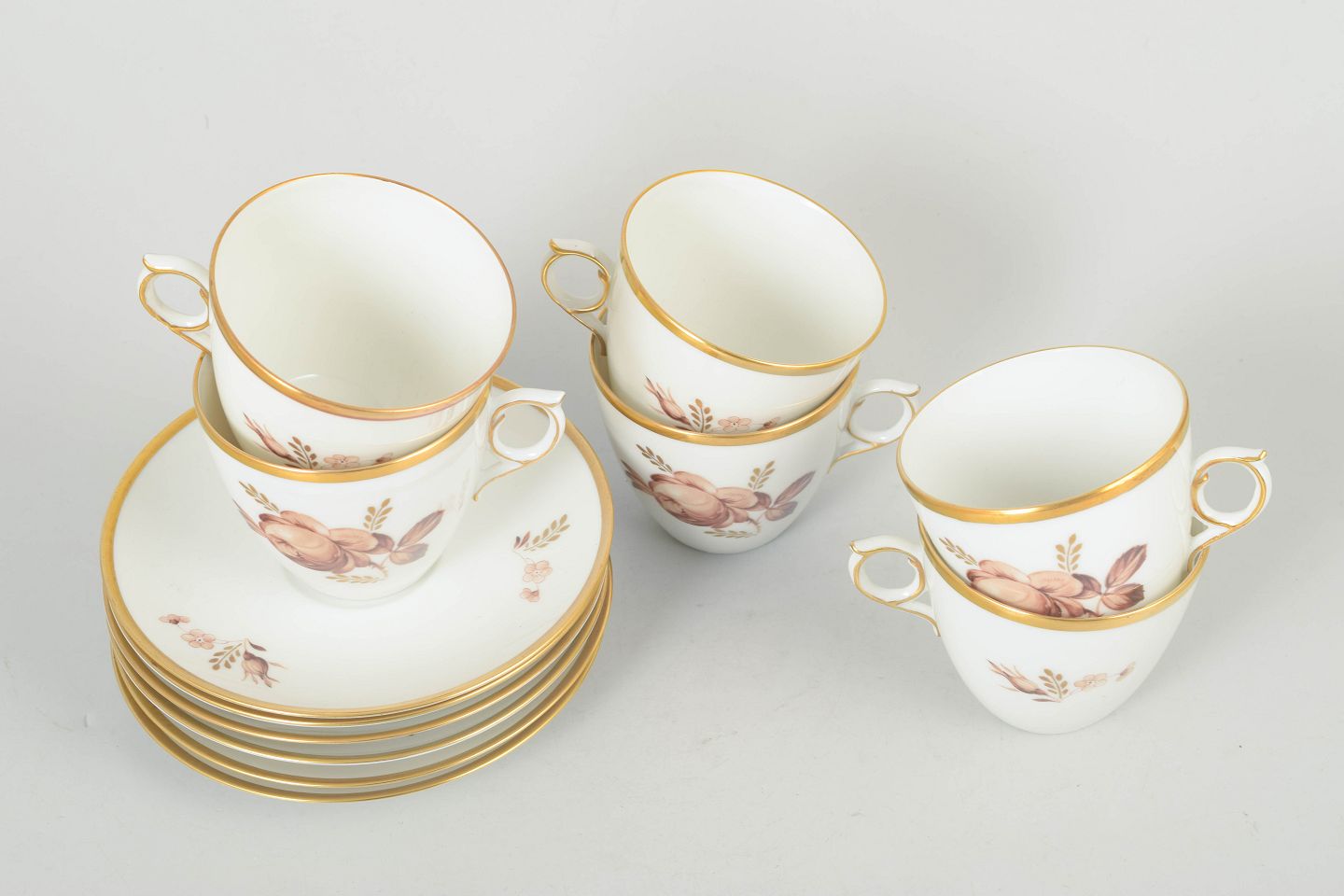 Elegant white porcelain service decorated with brown floral motif and gilt rim. Model 688/9069. First quality.