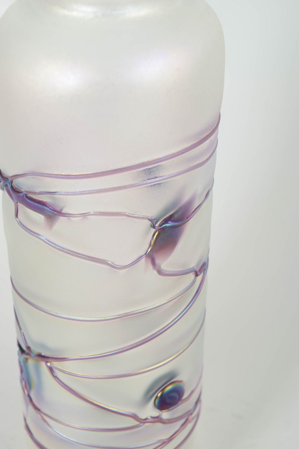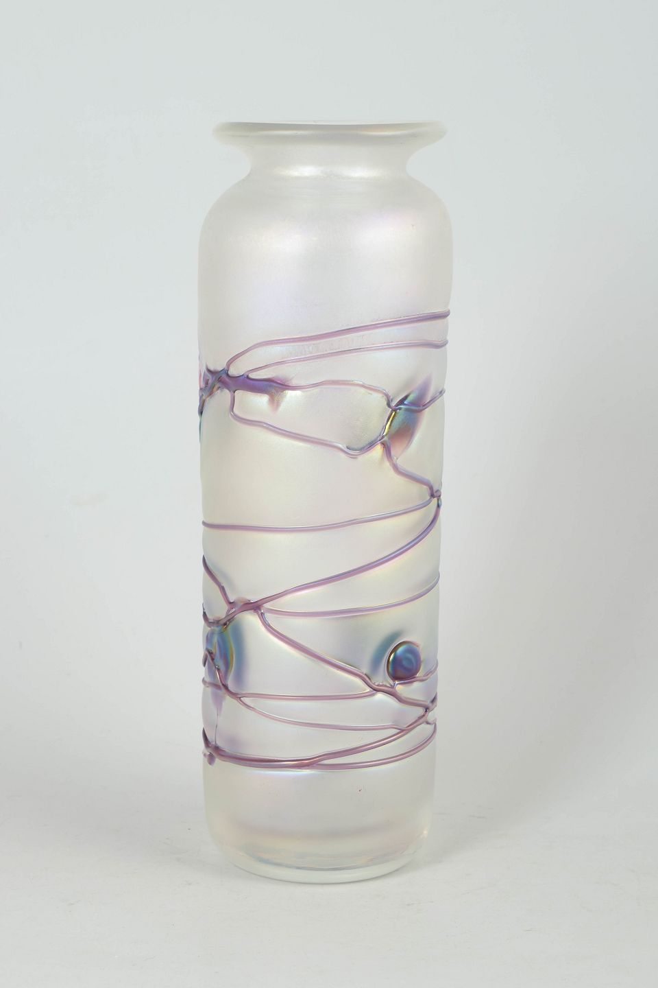 Cylindrical vase in mouth-blown glass with a frosted, iridescent surface and applied trailing decoration in violet and blue tones with small glass applications.